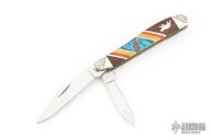 This slipjoint by Case has been given a custom handle by David Yellowhorse and is one of a limited edition of 150. Features two mirror finished blades with nail nicks. The handle has nickel silver bolsters and butt, ironwood/turquoise with nickel silver spacers, brass liners and stainless steel springs. Has half-stops. Comes with original box and papers. Excellent condition.
