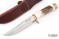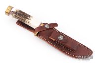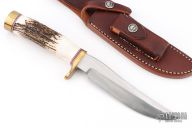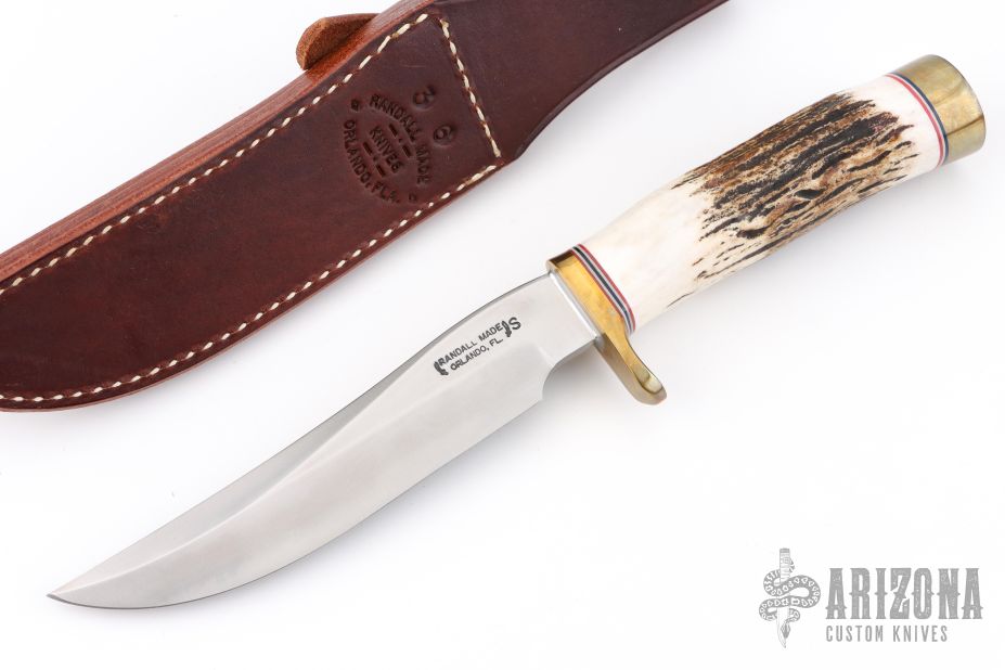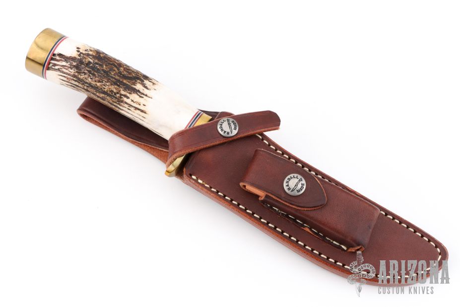 This Model 3-6 by Randall features a satin finished stainless steel blade with false top edge, .222" blade stock and 1.179" blade depth, hidden tang construction. The handle has a brass guard and butt, and stag grip with red/white/blue spacers. Comes with a brown leather sheath and original paper wrapping. Excellent condition.