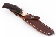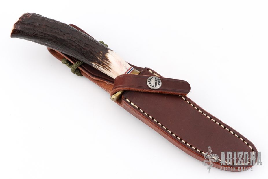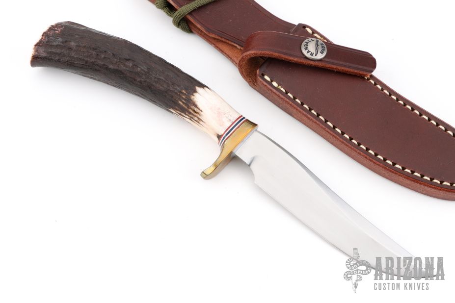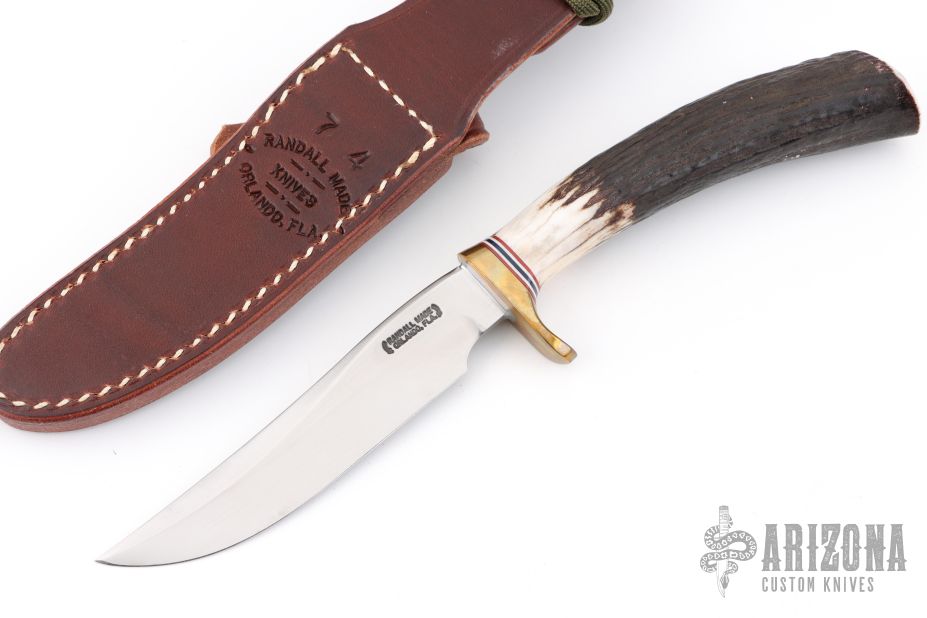 This Model 7-4.5 by Randall Made Knives features a satin finished blade with false top edge, .164" blade stock and .908" blade depth, hidden tang construction. The handle has a brass guard, stag grip and red/white/blue spacers. Knife comes with a brown leather sheath and original paper wrapping. Excellent condition.