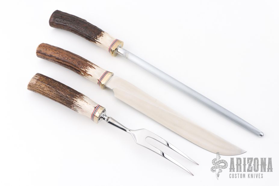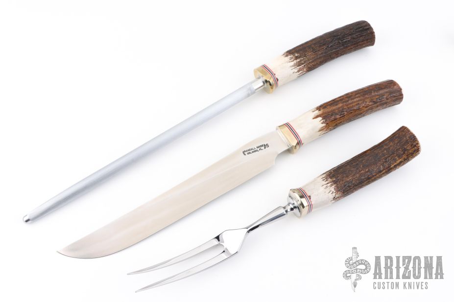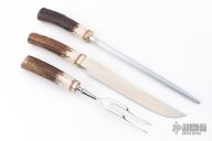 "Designed to meet every requirement as the ideal table knife, it is rustproof and will resist staining as ordinary blades do when used in carving meat. Complete with high-quality stag handled Sharpening Steel and Fork. A three-compartment felt case is included. " Satin finished blade with .170" blade stock and 1.194" blade depth, hidden tang construction. Nickel silver guards with stag grips and black/duralumin spacers. Comes with cloth rollup, and original papers and paper wrapping. Excellent condition.