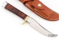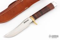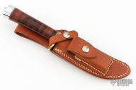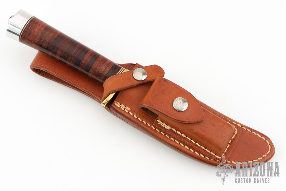 This Model 3-5 by Randall Made Knives features a satin finished blade with false top edge, .194" blade stock and 1.145" blade depth, hidden tang construction. The handle has a brass guard, stacked leather grip with red/white/blue spacers, duralumin butt. Comes with original sheath and Randall Knives pamphlet. Has some scuffs, excellent condition otherwise.