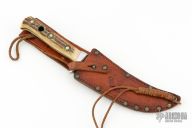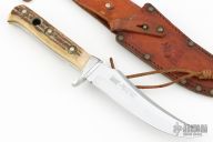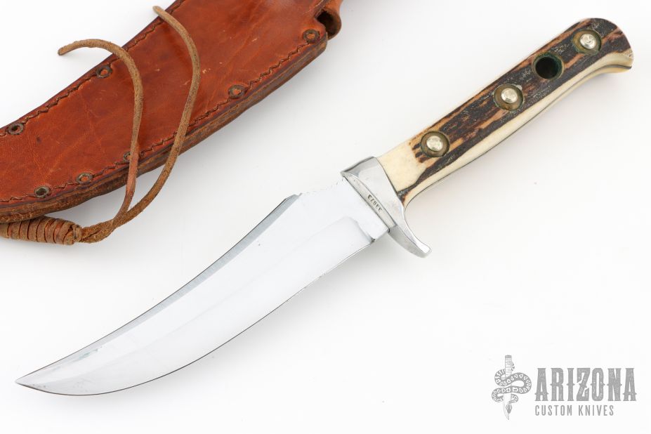 This skinner features a satin finished upswept blade with false top edge and a full tang construction, .129" blade stock and 1.142" blade depth.  The handle has an aluminum guard and stag scales with brass rivets. Includes a brown leather sheath. Has some light scratches and patina. Great condition for its age. #33073
