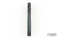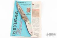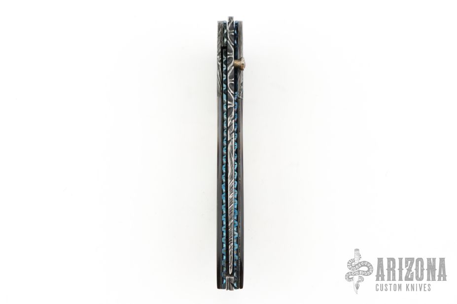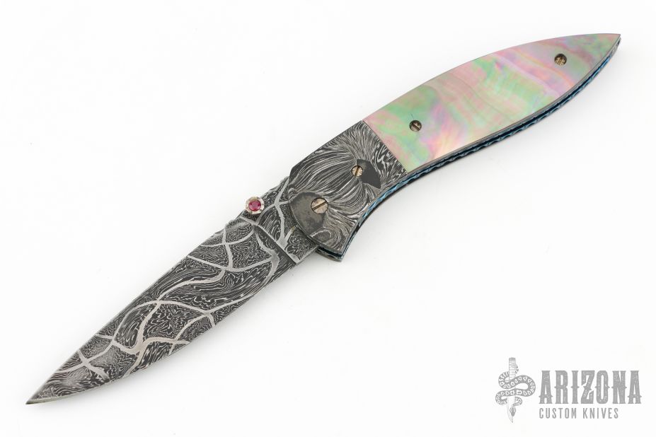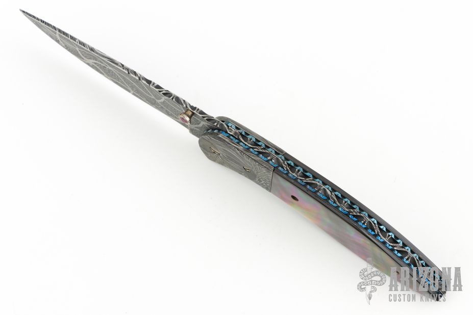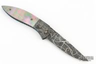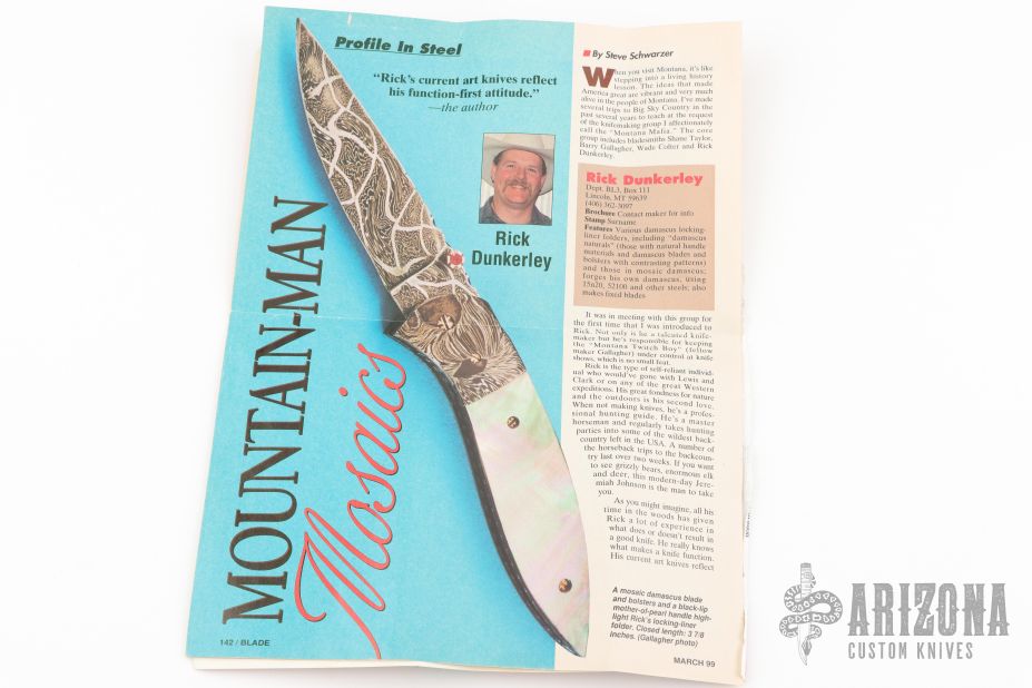 This knife by Rick Dunkerley features a mosaic Damascus blade with fileworked blade spine, and thumbstud with a ruby inset. The handle is comprised of dovetailed Damascus and presentation grade black lip pearl scales over file worked and anodized titanium liners. The backbar features file worked Damascus and all pins have been fileworked. A gorgeous piece. Silky smooth action. Comes with a zipper case. And some pages from Blade Magazine March 1999 that feature this knife. Excellent condition.