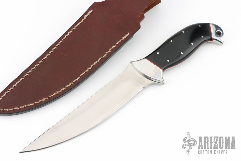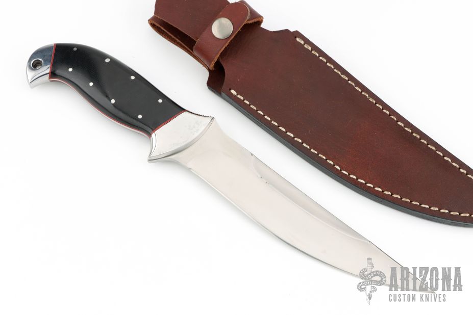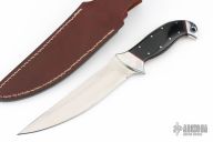 This PEW Fighter from Forge Master K. Ali features a satin finished spear point blade with false top edge and notched thumbrest, .204" blade stock and 1.408" blade depth, full tapered tang construction. The handle features 304 stainless steel dovetailed bolsters and pommel, black canvas micarta scales with red liners, stainless steel pins, lanyard hole at the butt. Includes brown leather sheath and original box. Has a couple small oxidation spots on the blade, otherwise excellent condition.