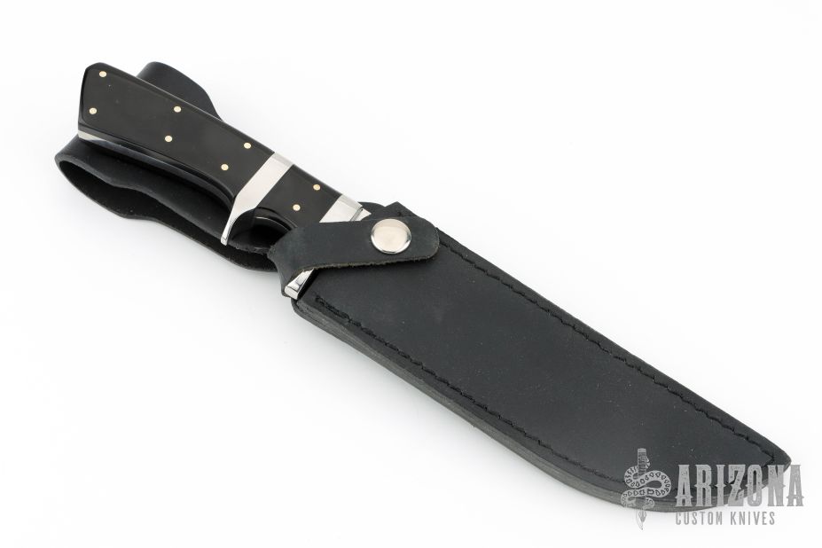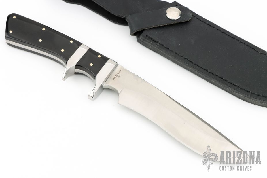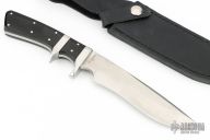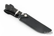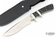This Sub-Hilt Fighter by Boker features a satin finished blade with a false top edge notched thumbrest, .200" blade stock and 1.364" blade depth, full tang construction. The handle has a stainless steel guard and sub-hilt, black paper micarta scales. Comes with a black leather sheath, original box and papers. #0095 on the blade. Excellent condition.