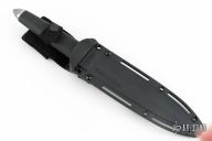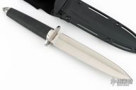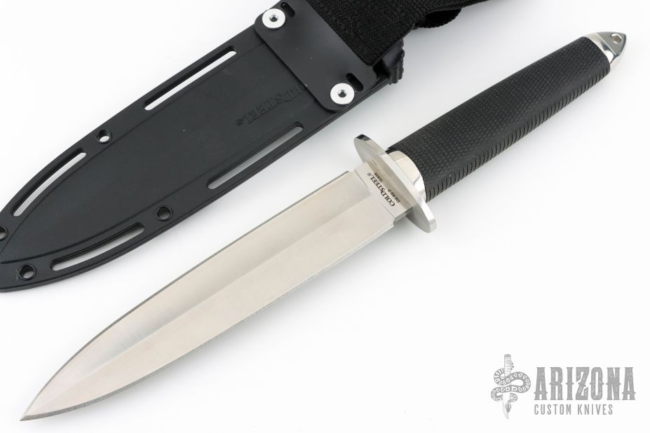 This Tai Pan from Cold Steel features a satin finished double-edged blade, .199" blade stock and 1.378" blade depth, hidden tang construction. The handle has a stainless steel guard and pommel, and rubber grip. Comes with a black sheath and the original box. Has a couple light scratches, otherwise excellent condition.