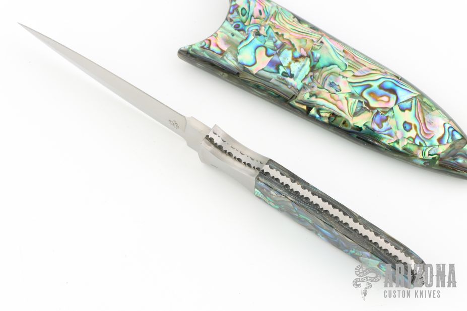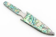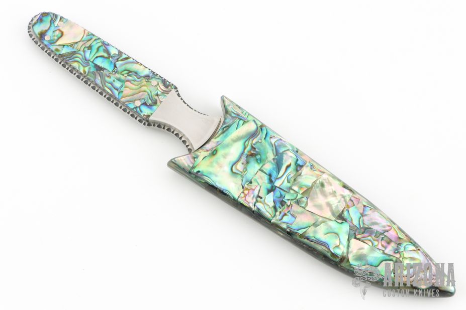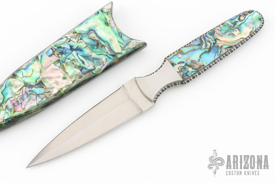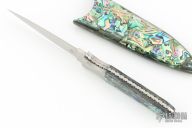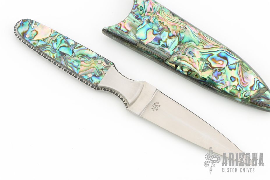 This Dagger by Bill Reddiex features a hand rub satin finished double edged blade with .132" blade stock and .870" blade depth, full tang construction. The handle has a stainless steel bolsters, abalone scales with a fileworked tang. Comes with an interesting abalone sheath. Has some light scratches, otherwise Excellent condition.