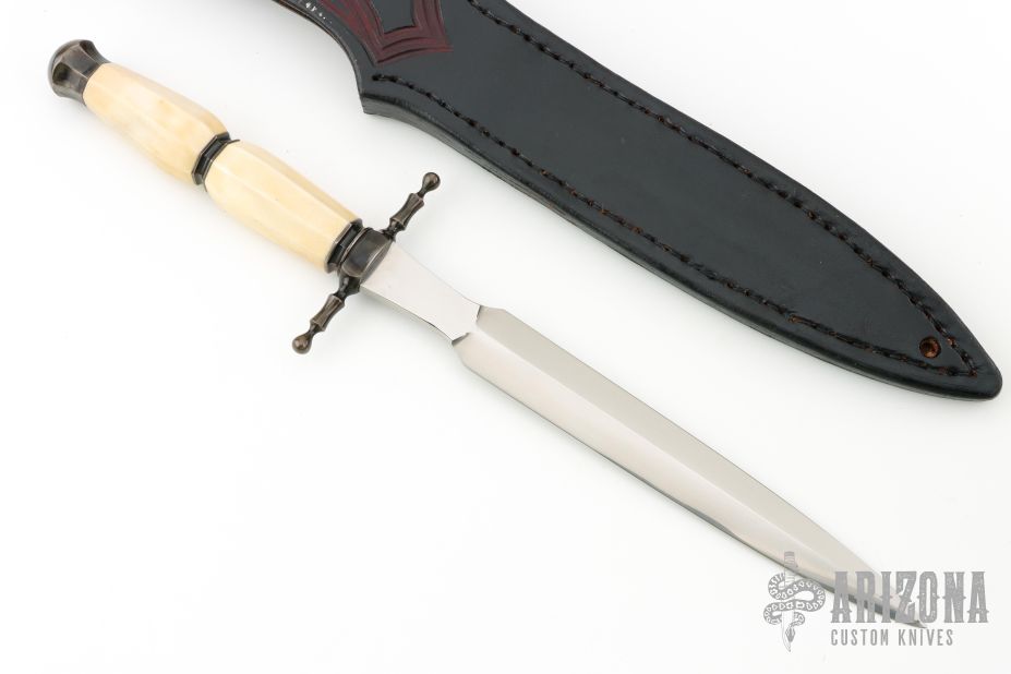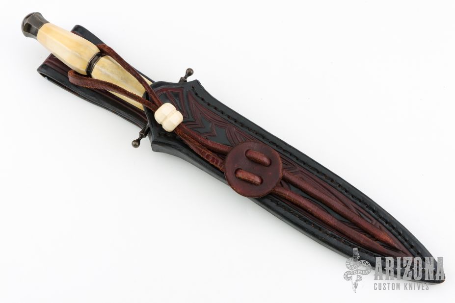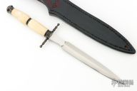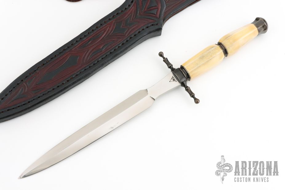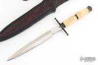 This Bowie by Mark Banfield features a hand rub satin polish finished blade with top edge, .229" blade stock and .989" blade depth, hidden tang construction. The handle has a fluted bronze guard, octagonal bone grip and spacers. Comes with a zippered case and hand tooled leather sheath. Has a little oxidation on the blade, and some light scuffs. Great condition otherwise.