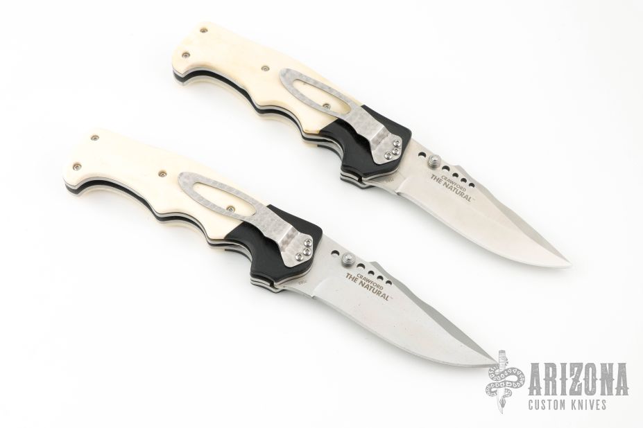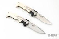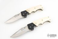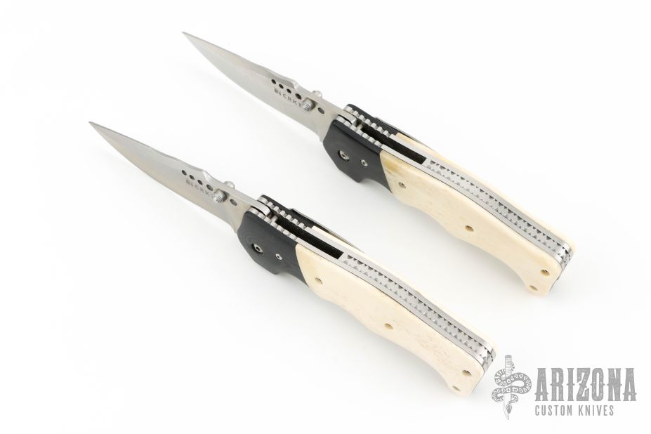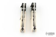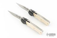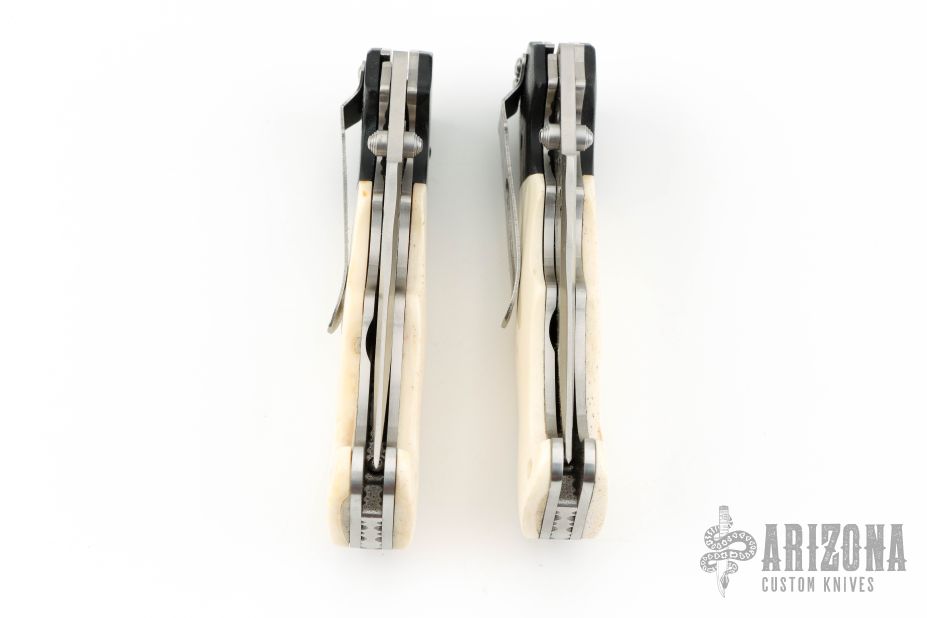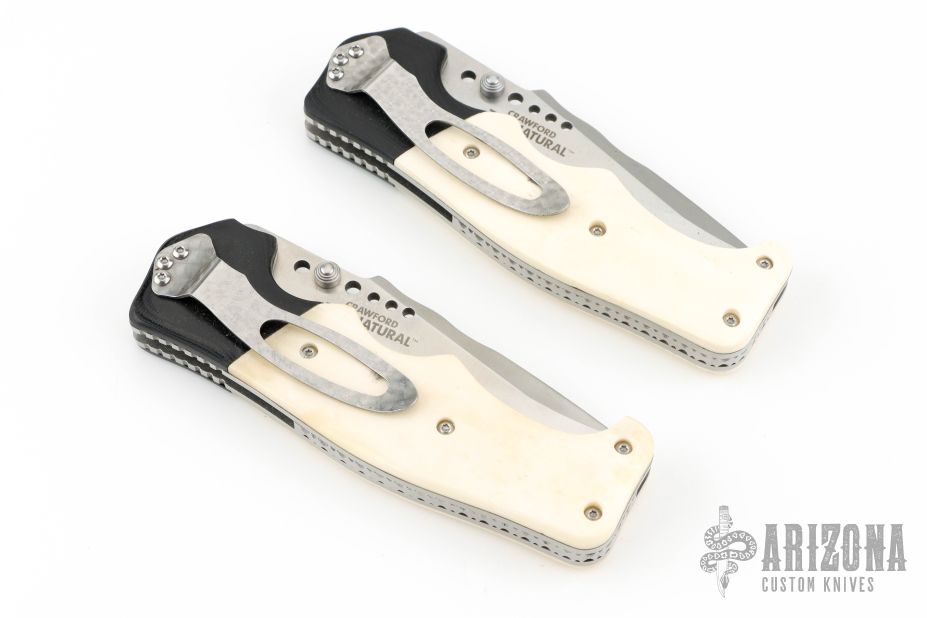 Crawford design. Assisted opening linerlock folder. Satin finished blade with dual thumbstuds. The handle has black G-10 boslters, bone scales, stainless liners and fileworked backspacer. Tip down jeweled stainless clip. Both come with original box, both are in excellent condition.