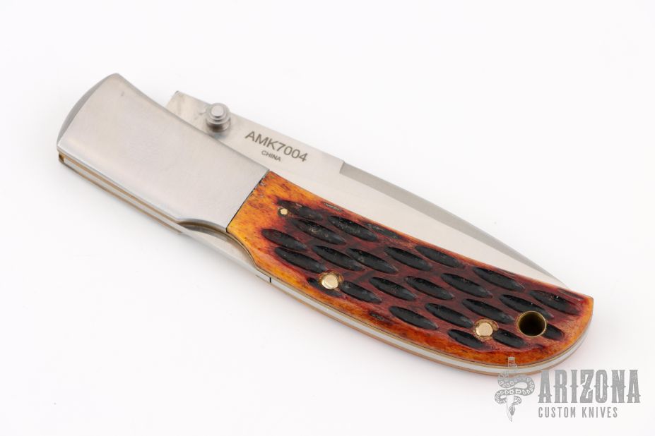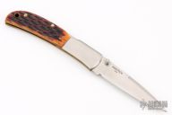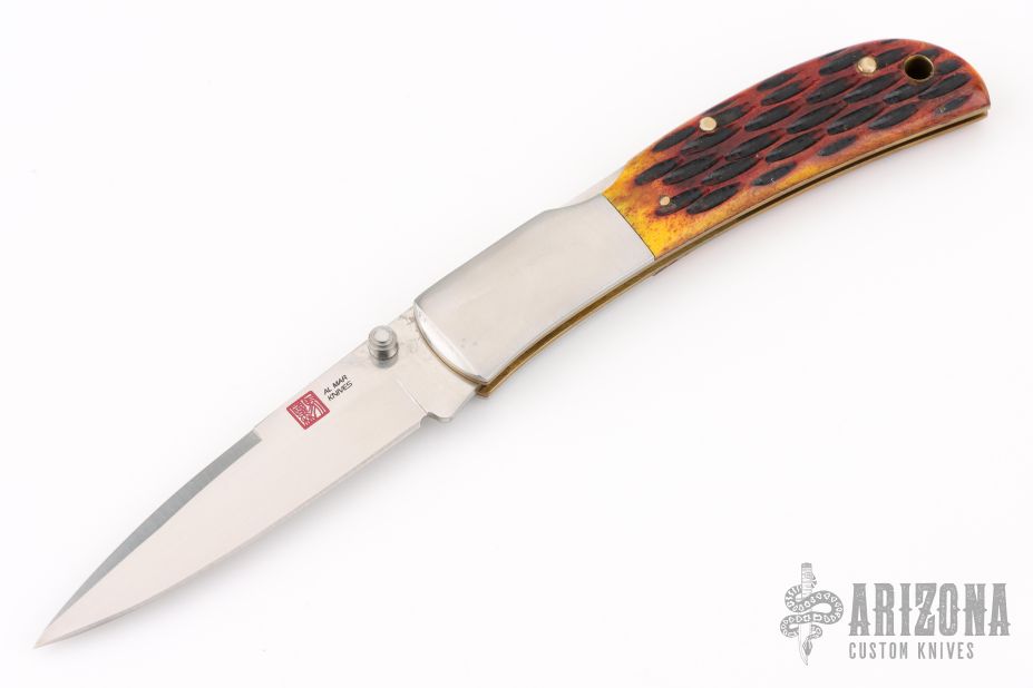This Falcon by Al Mar features a satin finished blade with false top edge and dual thumbstuds. The handle has stainless steel boslters, jigged bone scales, brass liners, stainless steel backspacer. Comes with original box, papers and brown leather slip sheath. Excellent condition.