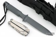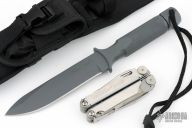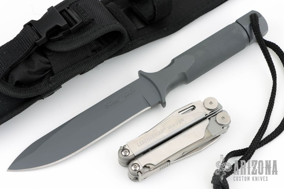 Comes with original box and papers. Has a couple light scuffs, otherwise excellent condition. The sheath has a Leatherman Wave in the auxilary pocket.
