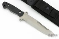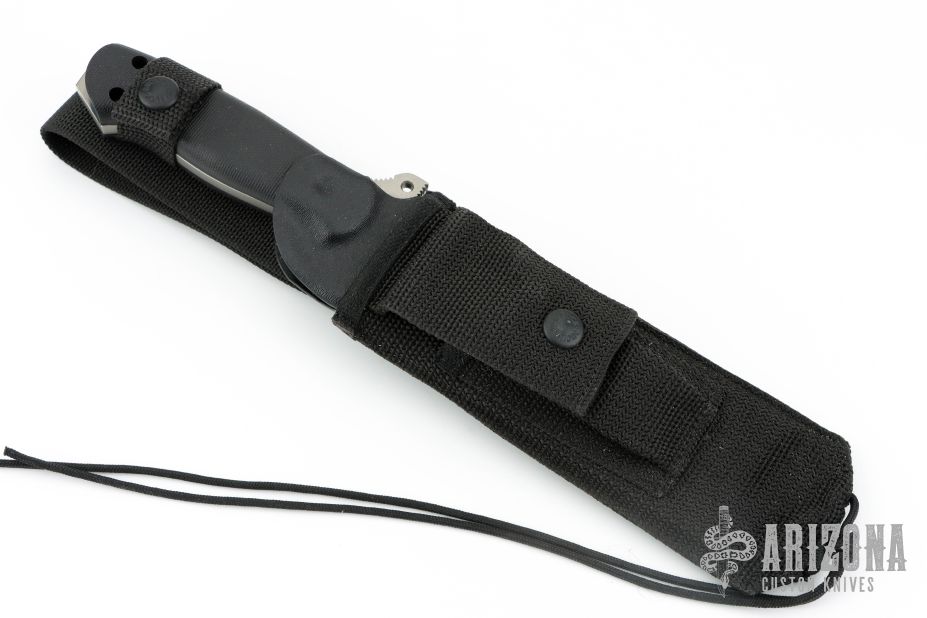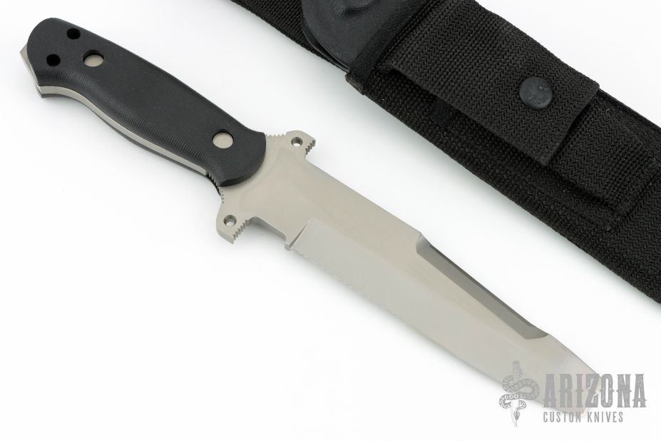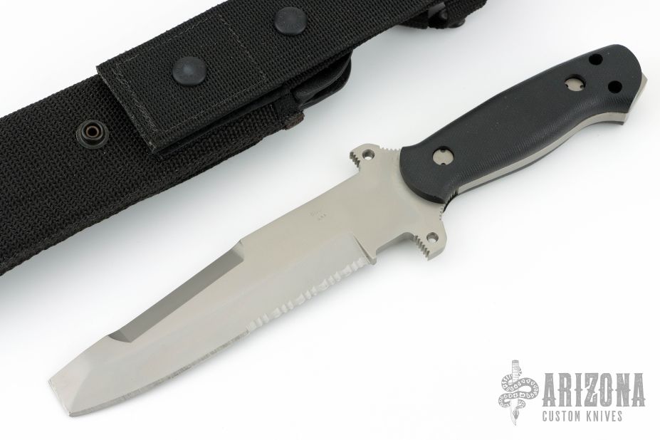 This Buck Knives model 189 Intrepid Dive knife features a partially serrated, tanto blade with full tang construction and thickness of 1/8" and depth of 1 1/4".  Black G10 scales. Sharpened top edge and serrations.  Knife comes with original box and kydex sheath with nylon belt loop. Has some light sheath marks, otherwise excellent condition.