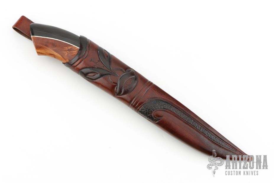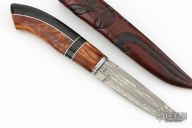 This awesome fixed blade by Roger Bergh features a Damascus blade with a false top edge, .146" blade stock and 1.187" blade depth, hidden tang contruction. The handle has fluted steel collar, wood and buffalo handle with nickel silver spacers. Includes a hand tooled leather sheath. Has some patina. Excellent condition.