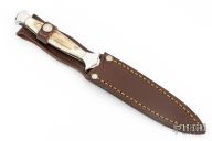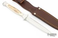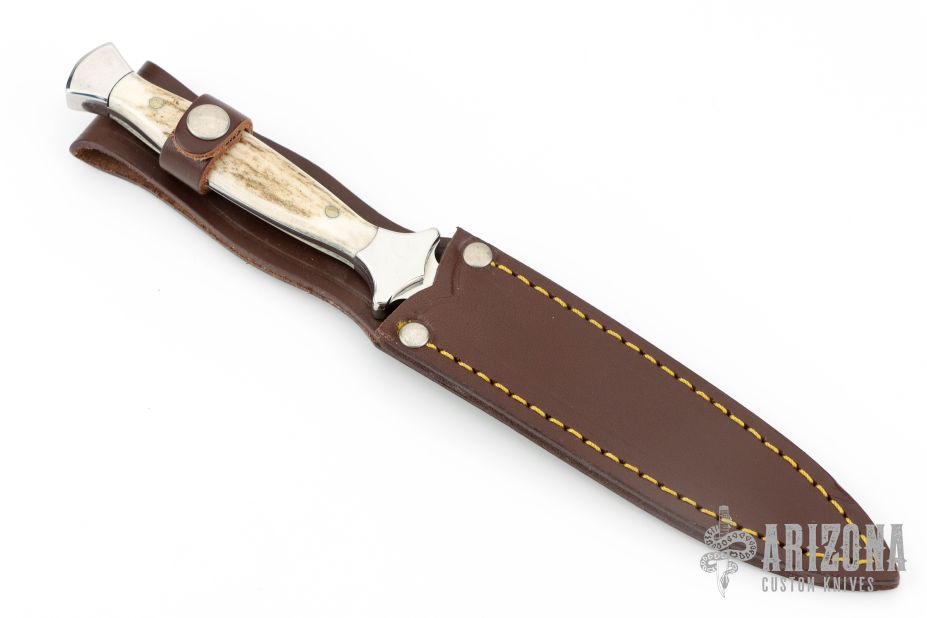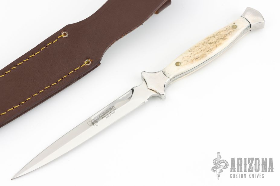 This dagger by Cudeman features a mirror polished double edged blade with full tang construction, .095" blade stock and .596" blade depth.  The handle features stainless steel bolsters, front and rear, with brass pinned stag scales. Comes with a leather sheath. Has a few light scratches, otherwise excellent condition.