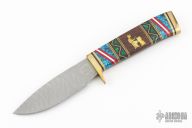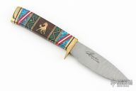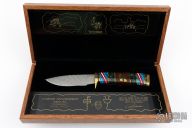 Beautiful fixed blade customized by David Yellowhorse. "Knapped" blade with brass guard and pommel. Brass "Cuthair Yellowhorse" inlay in ironwood. Spacers of turquoise, brass, black, pearl and red. Comes in original wooden display box with engraved plaque and original papers. Excellent condition. S/N 0232