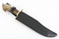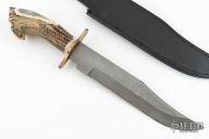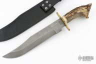 This Parker-Edwards Bowie features a Damascus blade with false top edge, .181" blade thickness and 1.682" blade depth, hidden tang construction. The blade is marked with the Parker-Edwards stamp, "Bench Made Randall Gilbreath". Includes a black leather sheath. Has some light oxidation and patina, otherwise good condition for its age.