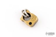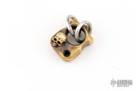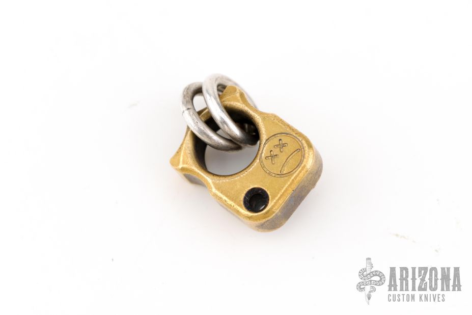 This Brass nano SFK by Andy Frankart is 1" long, has a .445" hole and has two silver jump rings for necklace mounting. This edition by Steel Flame is finished with antique patina and warrior skull embellishment. Has some wear, and light scuffs otherwise great condition.