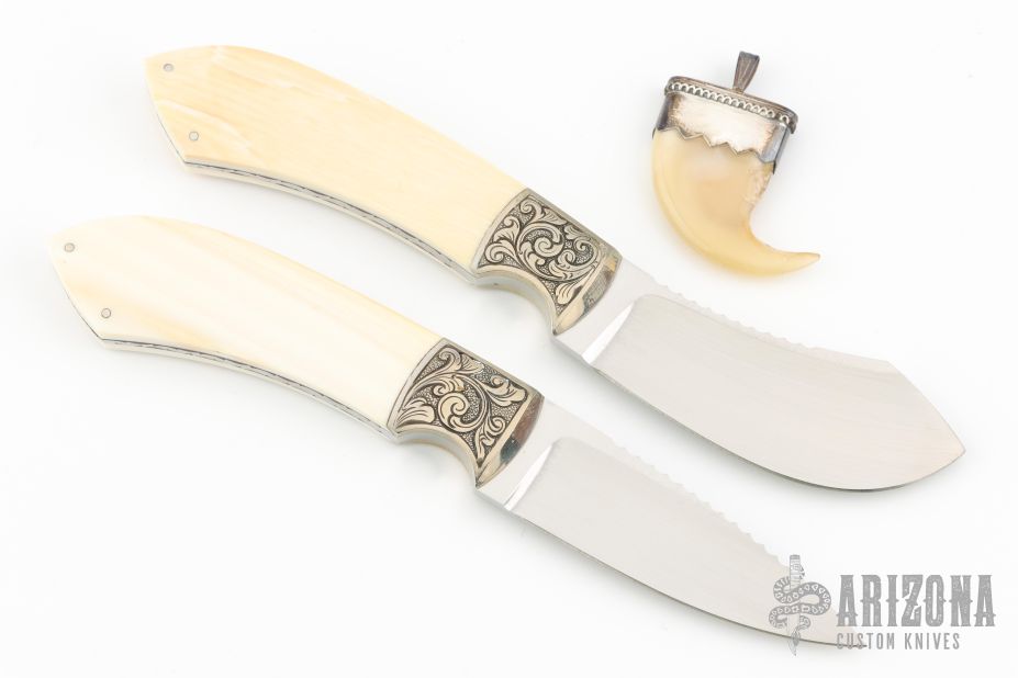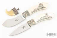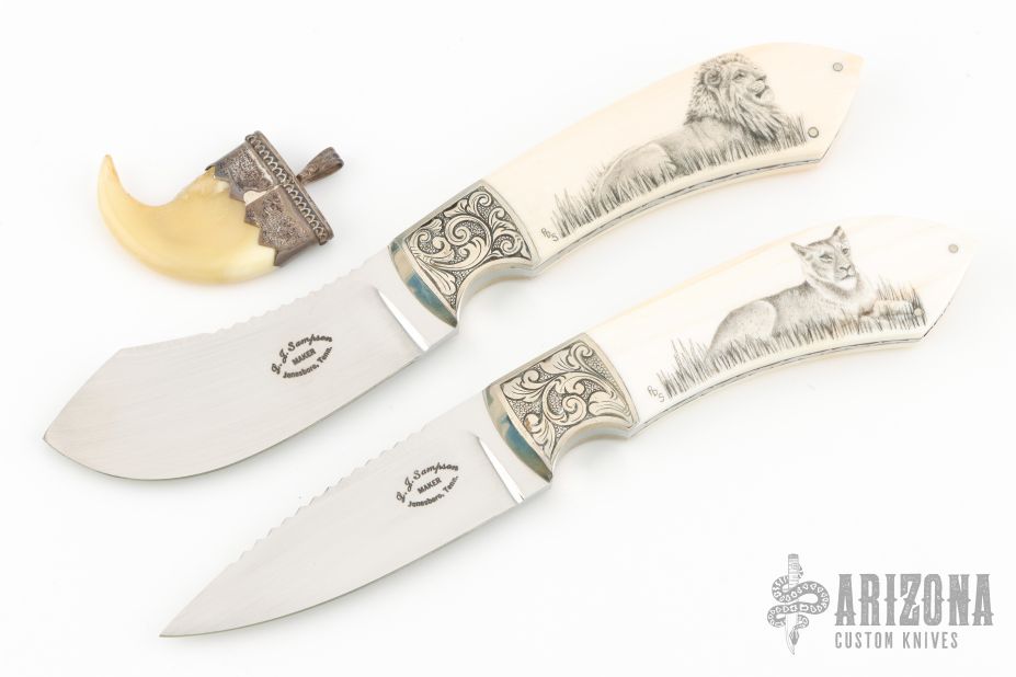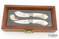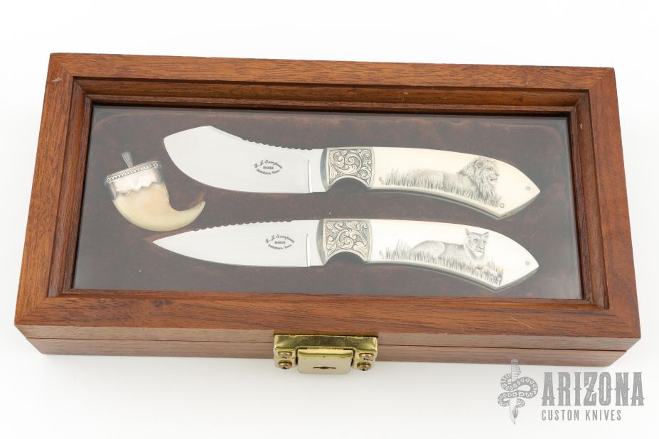 Very nice wood presentation box with glass top and felt liner containing two skinning knives with lion and lioness scrimshaw scene, and a claw that has a pendant/necklace bail.