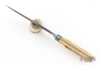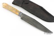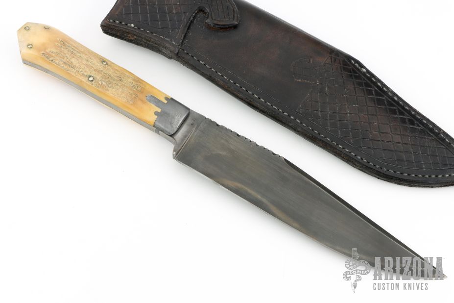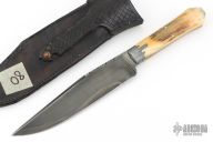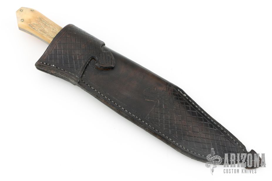 This Bowie by Willard Smith features a clip point blade with false top edge and fileworked spine, visible temper line, .262" blade stock and 1.590" blade depth, full tapered tang construction. The handle has cast pewter bolsters, stag scales. Comes with a hand tooled brown leather sheath. Has some light scratches, otherwise excellent condition. Stamped WS on the ricasso.