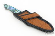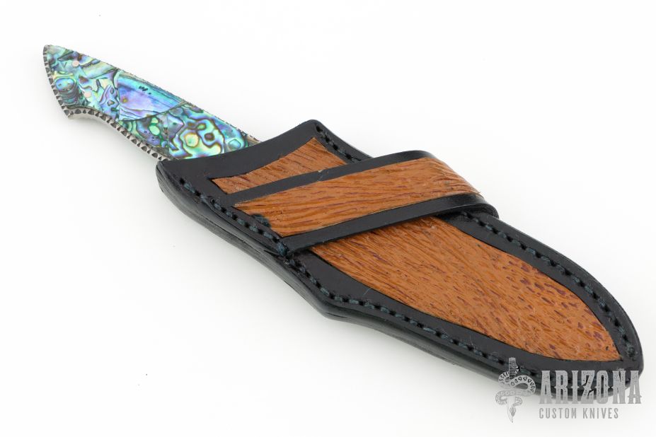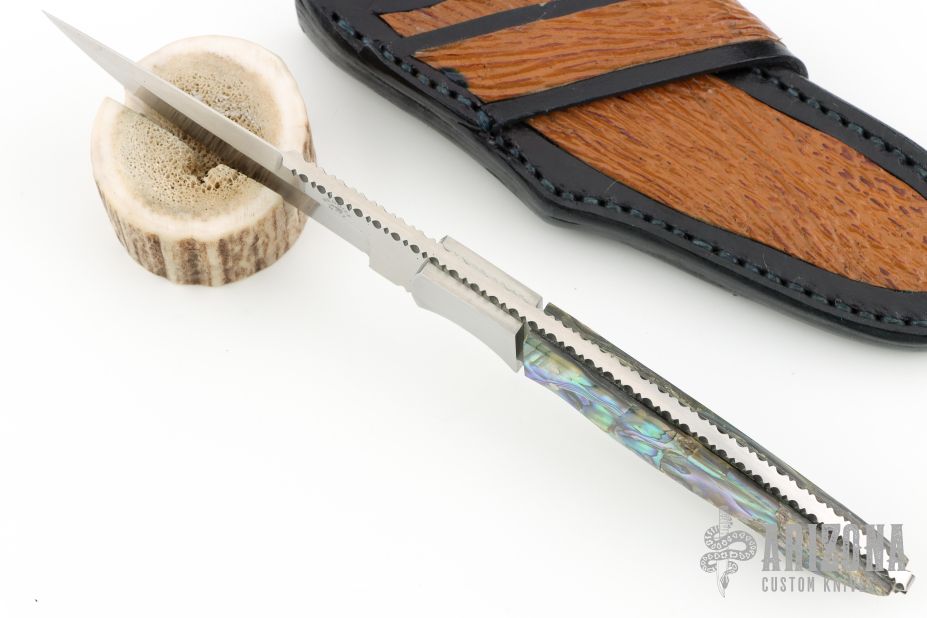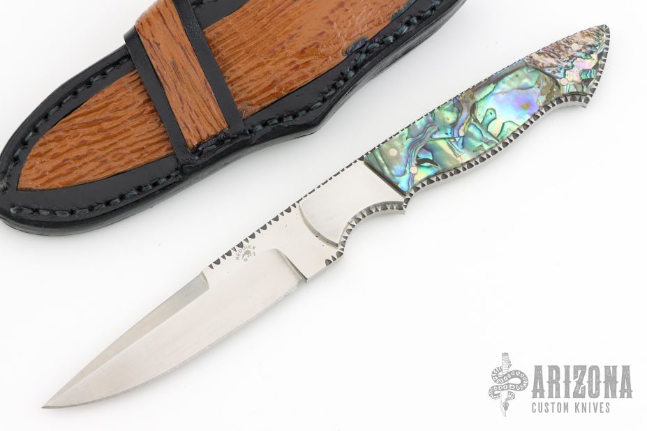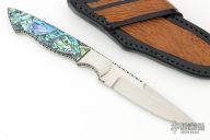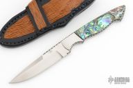 This hunter by Bill Reddiex features a hand rub satin finished blade with false top edge, .168" blade stock and .880" blade depth, full tang construction. The handle has stainless steel bolsters, abalone scales with a fileworked tang. Comes with a hand tooled brown leather sheath. Has some scratches, great condition otherwise.