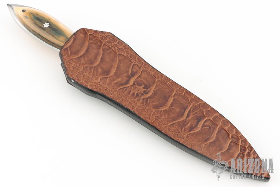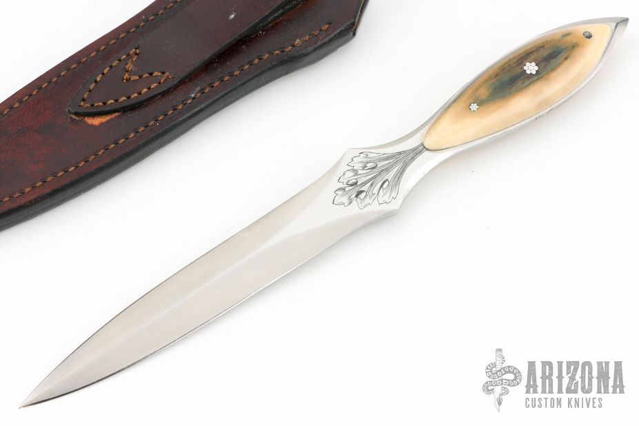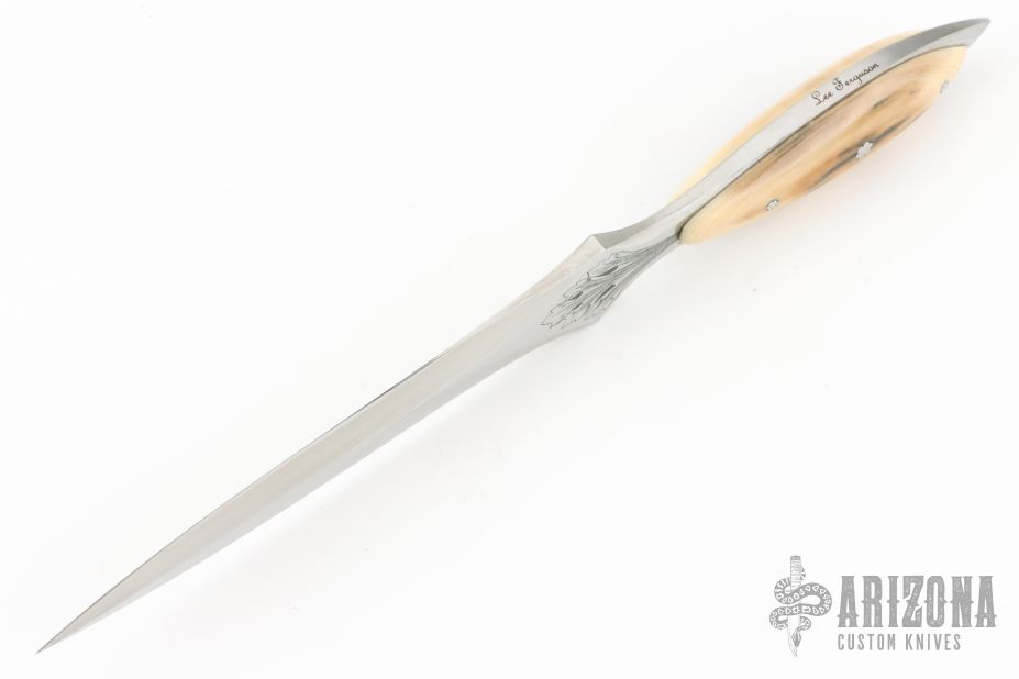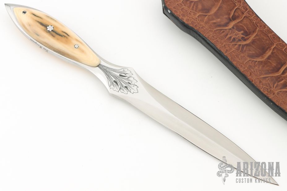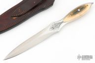 This Dagger by Lee Ferguson features a hand rub satin finished double-edged blade with mirror polished and engraved flats, .181" blade stock and 1.026" blade depth, full tang construction. The handle has a mammoth ivory scales with mosaic pins. Comes with a brown leather sheath with ostrich leg skin overlay. Excellent condition.