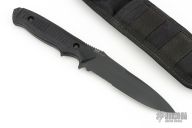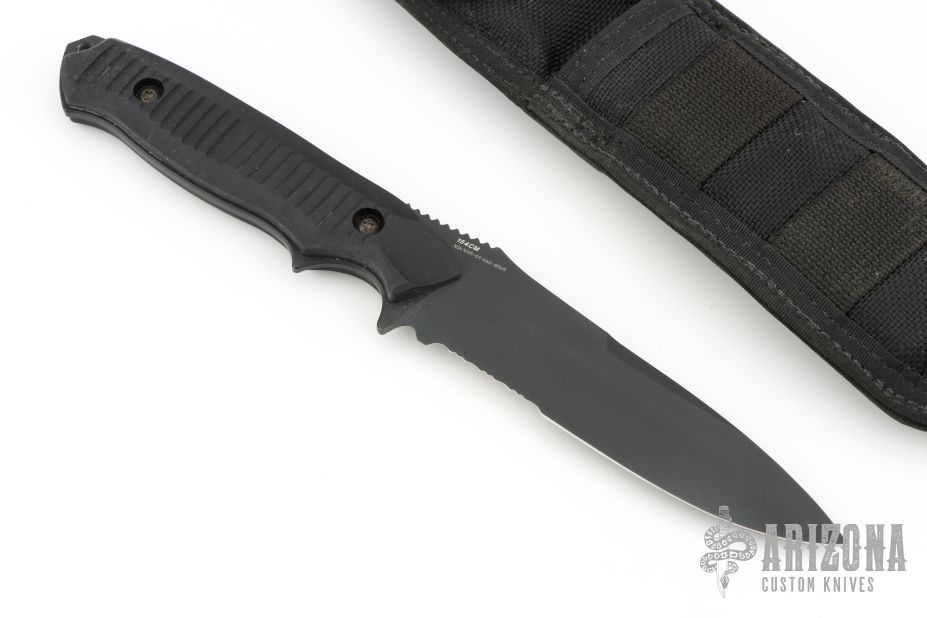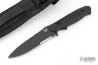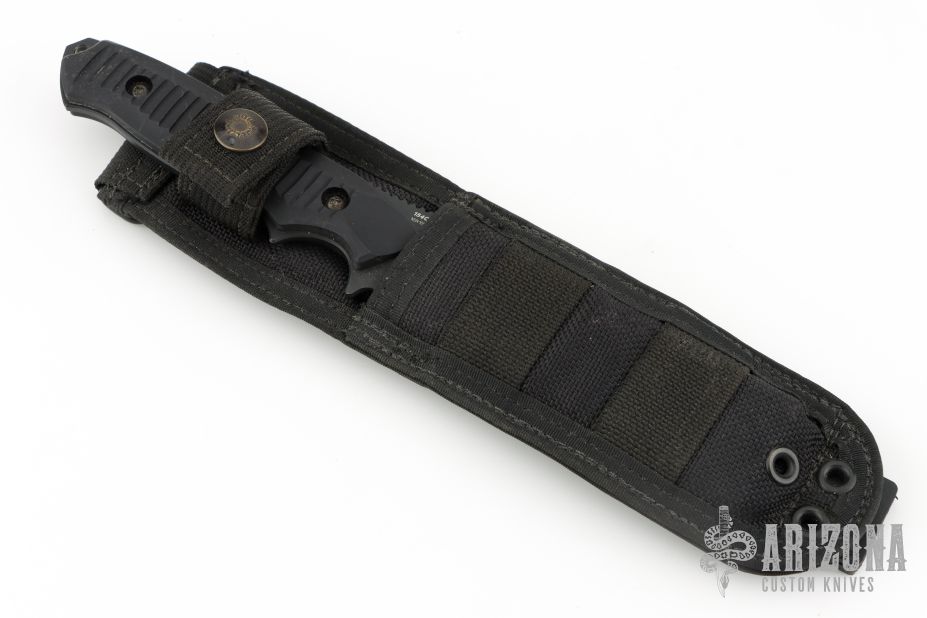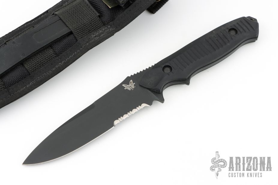 This Nimravus by Benchmade has a black blade drop point blade with a full tang construction.  .117" Blade Stock.  1.235"Blade Depth.  The handle has black aluminum scales.  Includes a nylon sheath. Has some light scuffs, otherwise excellent condition.