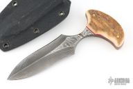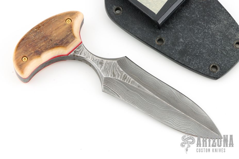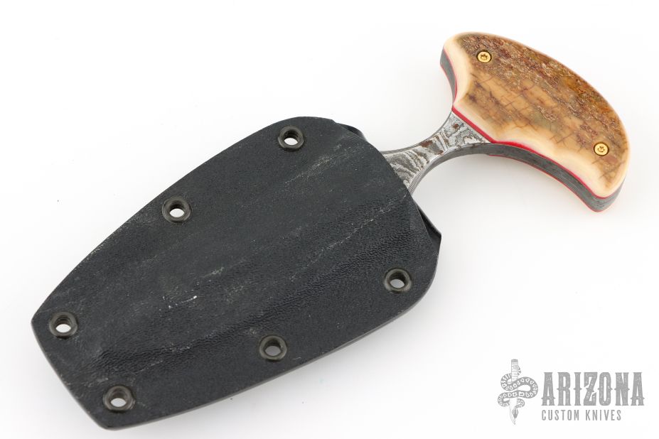 This push dagger from Mike Irie features a Damascus double edged blade, .262" blade stock and 1.163" blade depth, full tang construction. The handle has mammoth ivory scales over red liners. Includes a Kydex sheath with belt clip. Excellent condition.
