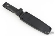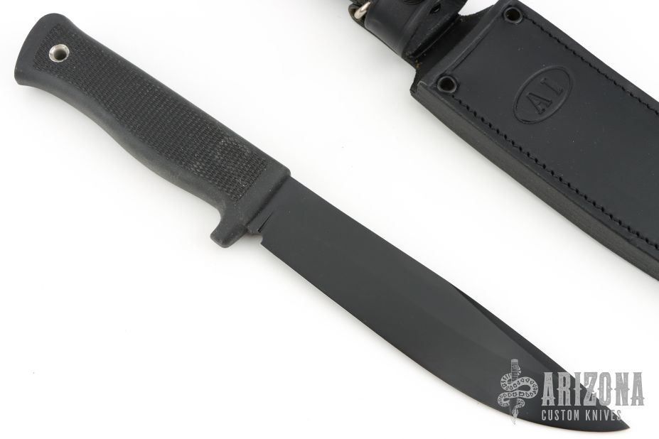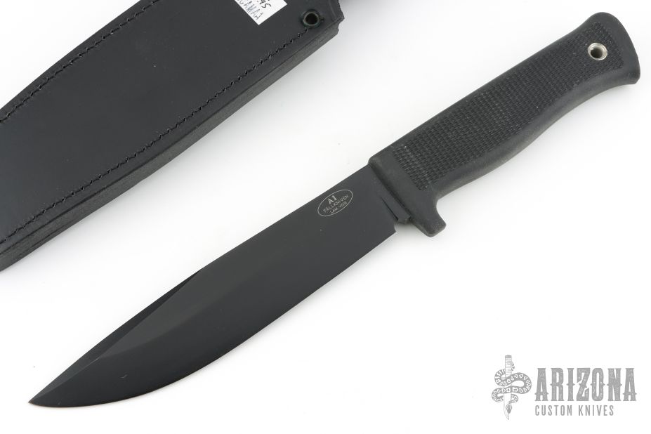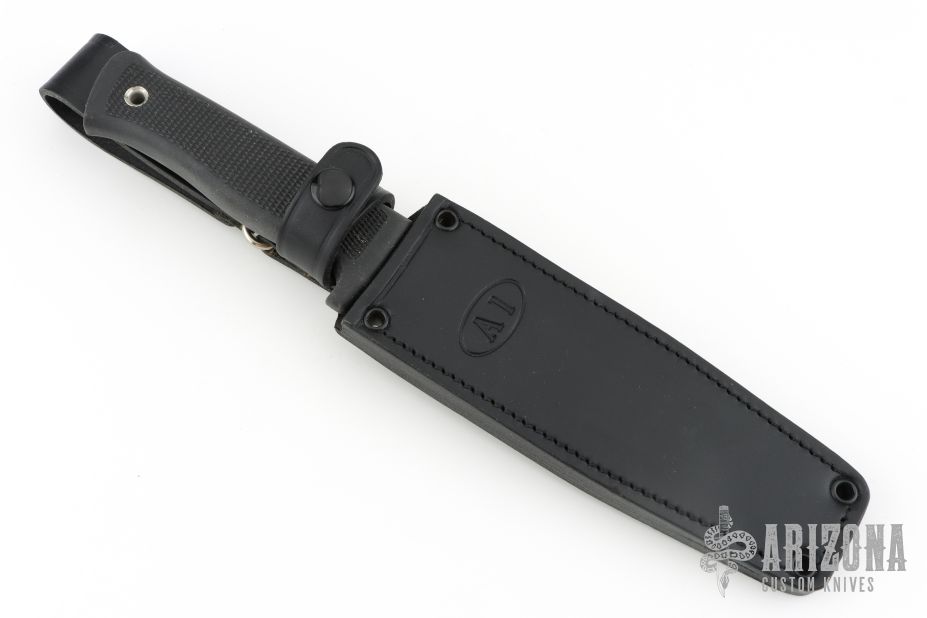 The Model A1 by Fallkniven is a semi-large all-purpose knife for heavy duty use. The powerful blade is made of extremely hard yet tough laminated VG10 steel and will withstand the stress of hard use. The knife is superb to chop with, but also works very well with daily tasks, thanks to the ergonomic grip. The full tang goes entirely through the handle, so you can strike the end of it without breaking the grip. The sturdy black zytel sheath allows you to fasten the knife on your belt or your pack - even upside down. Model A1 is a water repelling concept which works just as well in extreme cold as in stifling heat. Has a black ceracoated spear point blade with false top edge, .236" thick and 1.286" deep. Comes with black leather sheath. Excellent condition.