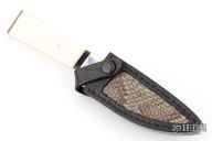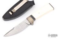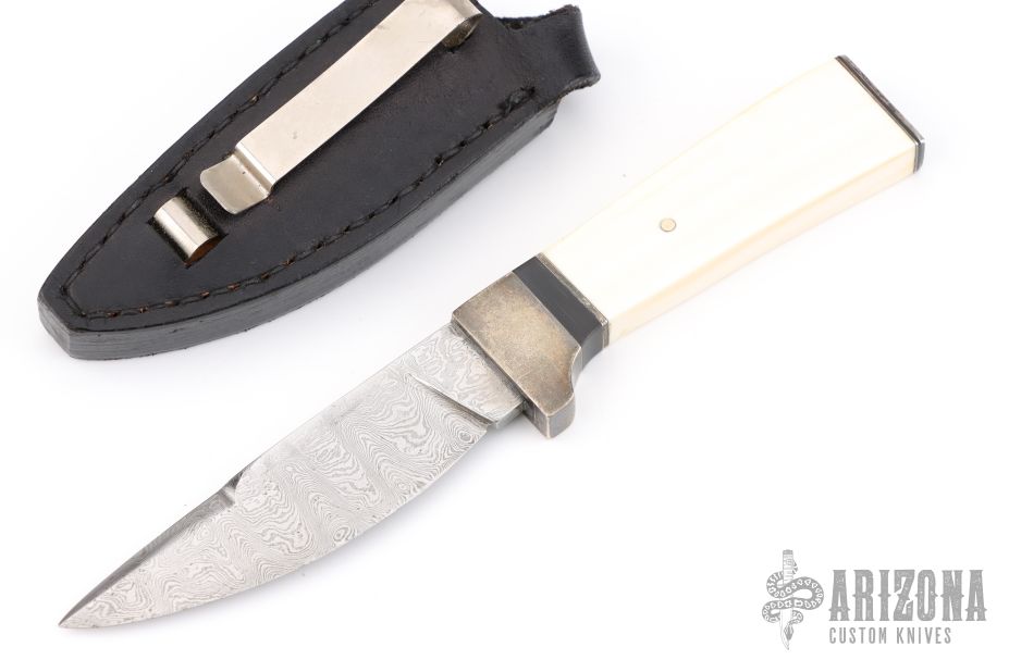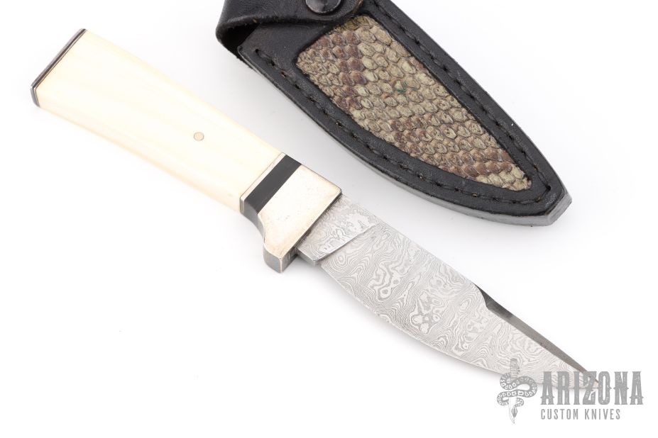 This knife features a Damascus drop point blade with a hidden tang construction. .146" blade stock, .789" blade depth. The handle features a silver guard, black spacer, and white bone grip. Includes a leather sheath with snakeskin inlay and clip. Has some light scratches, and patina. Great condition.