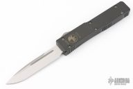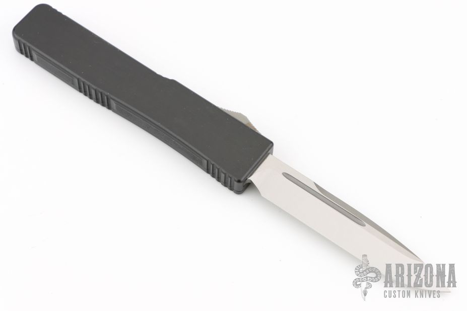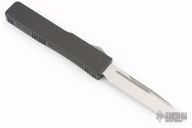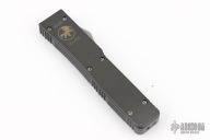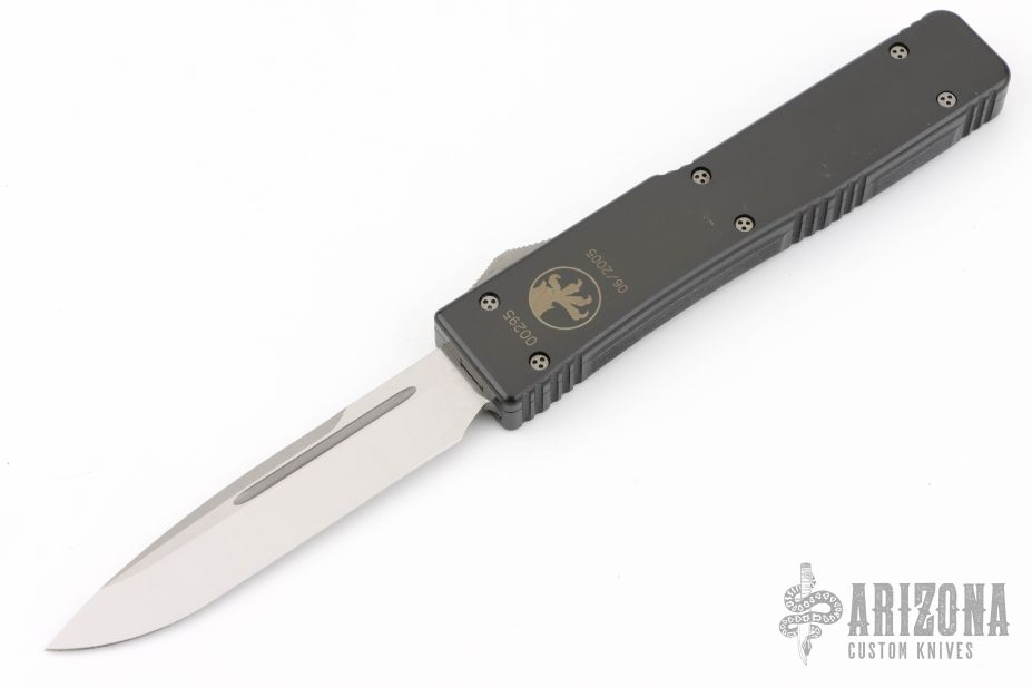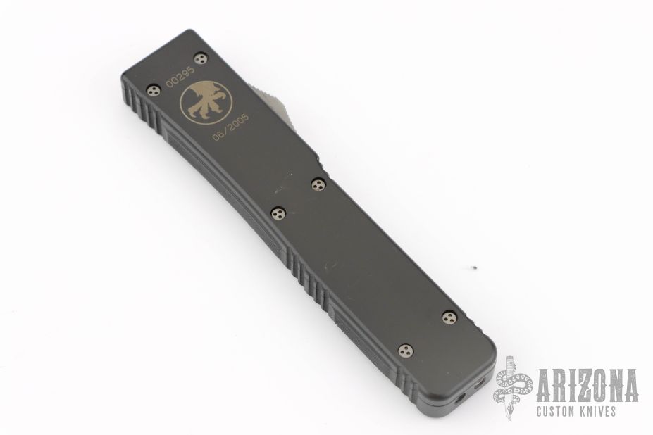 This Early Ultratech by Microtech Knives features a drop point satin finished blade with swedge and fullers. The handle has a black anodized aluminum with ramped steel thumb slide and holes for a tip down clip, but no clip. S/N of 00295 dated 06/2005. Has scuffs and scratches, no clip, good user condition otherwise.
