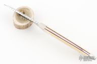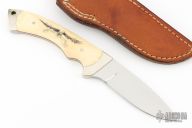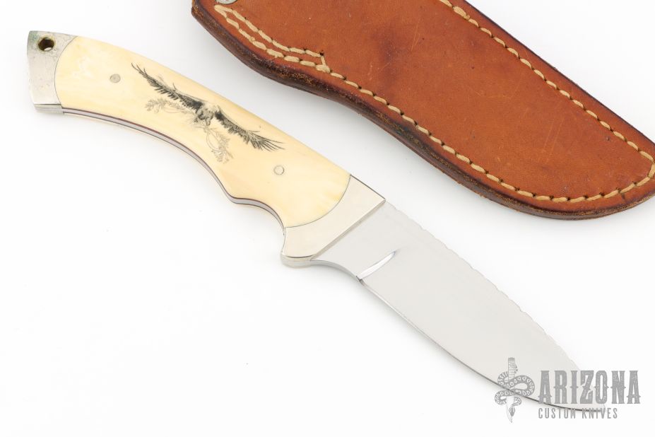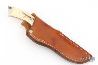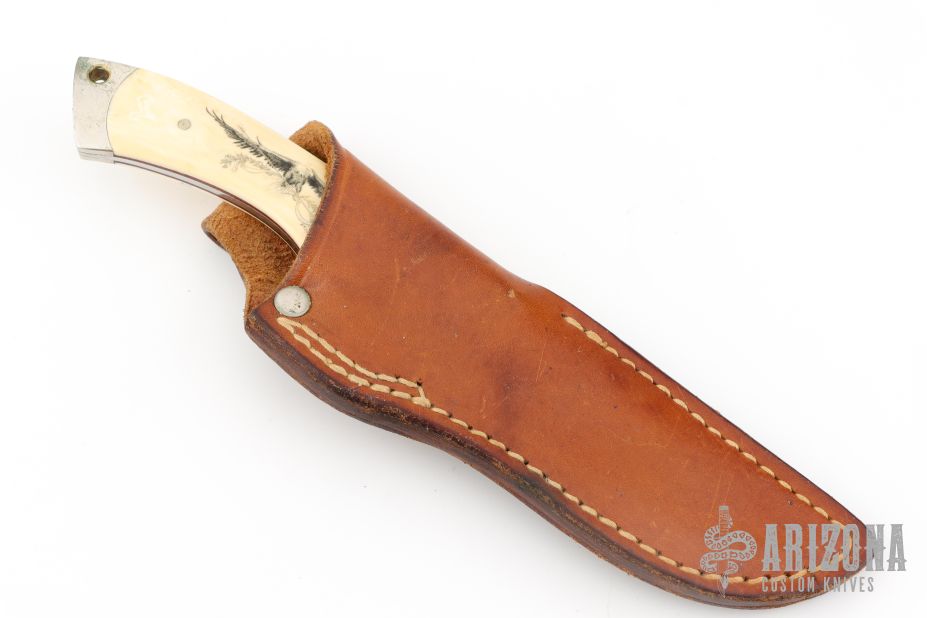 This custom fixed blade by Bill Duff features a mirror polished drop point blade with fileworked spine, .167" blade stock and 1.061" blade depth, full tapered tang construction. The handle has nickel silver bolsters, mammoth ivory scales with red liners. One of the scales is scrimshawed with an eagle. Comes with a brown leather sheath that is signed and dated 1981. Has some scratches, otherwise good condition.
