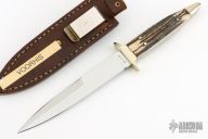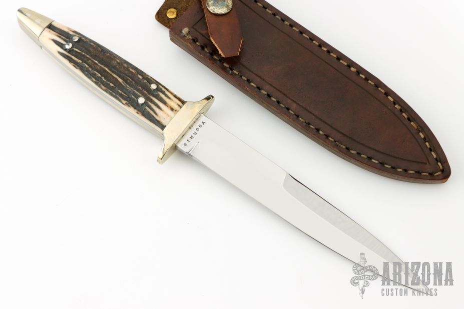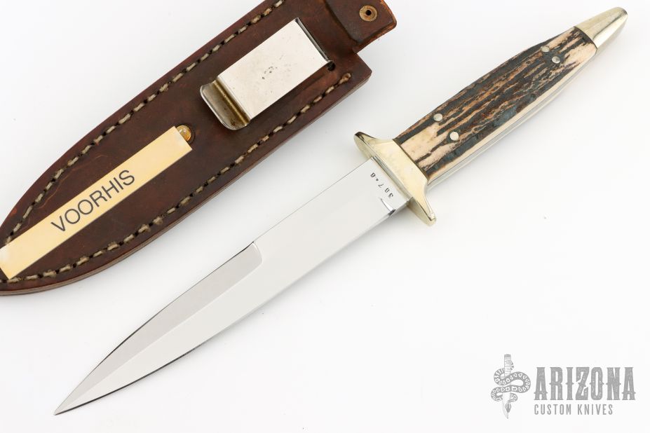 This Boot Dagger from Steve Voorhis features a mirror polished double edged blade with .170" blade stock and .965" blade depth, full tang construction. The handle is comprised of a nickel silver guard and rear bolsters, stag scales. Comes with brown leather sheath boot clip. Excellent condition. #387-8