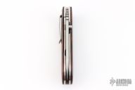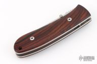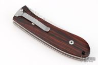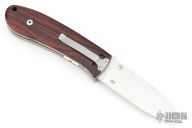 This DK-FHL linerlock folder by Dozier Knives has a satin finished D2 stainless steel drop point D2 blade with notched thumbrest and single thumb stud. The handle has desert ironwood scales, titanium liners and a desert ironwood backspacer. Tip down titanium pocket clip.  Excellent condition.