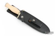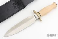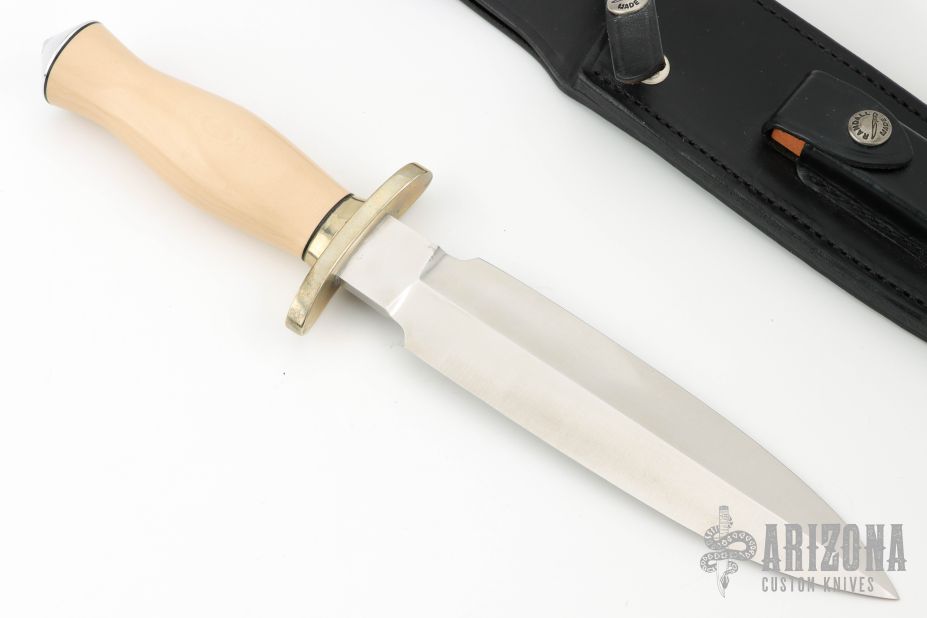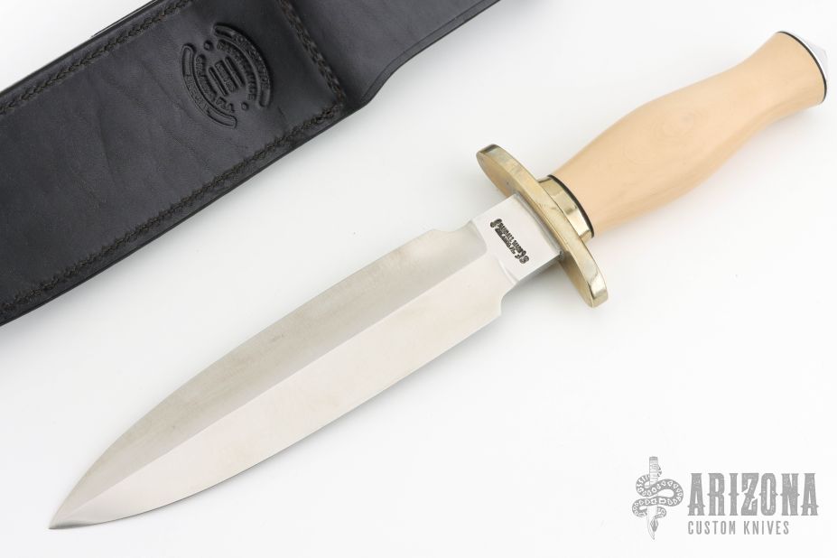 This Tom Clinton Special by Randall Made Knives has a double-edged stainless steel satin finished blade, 207" blade stock and 1.605" blade depth, hidden tang construction. The handle has a forward curved nickel silver guard, ivory paper micarta grip, duralumin butt. Comes with a black leather sheath. Excellent condition.