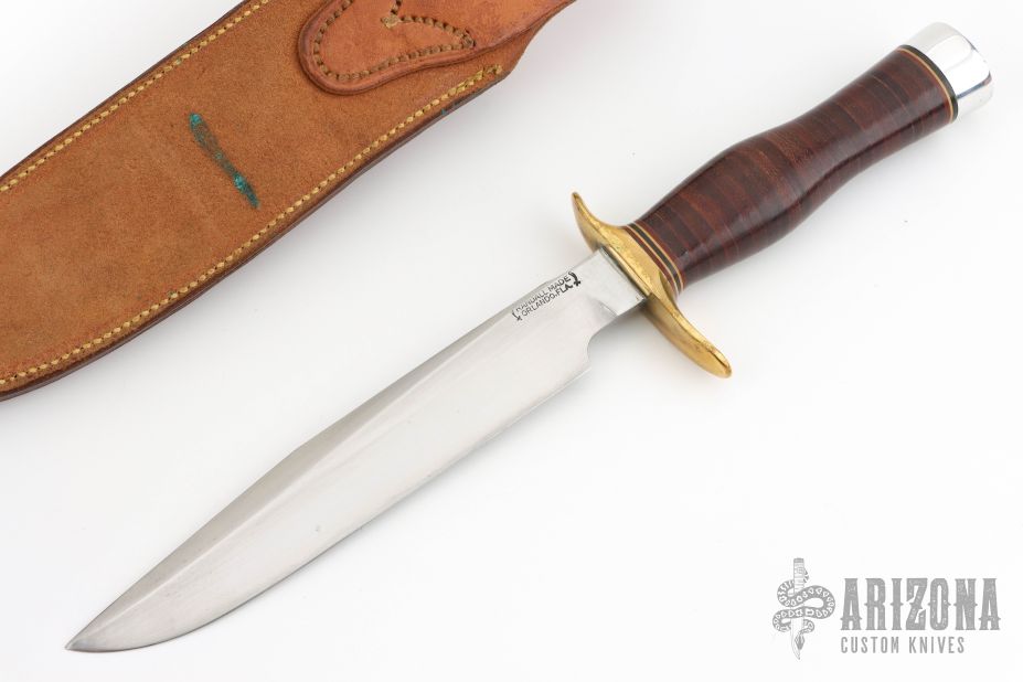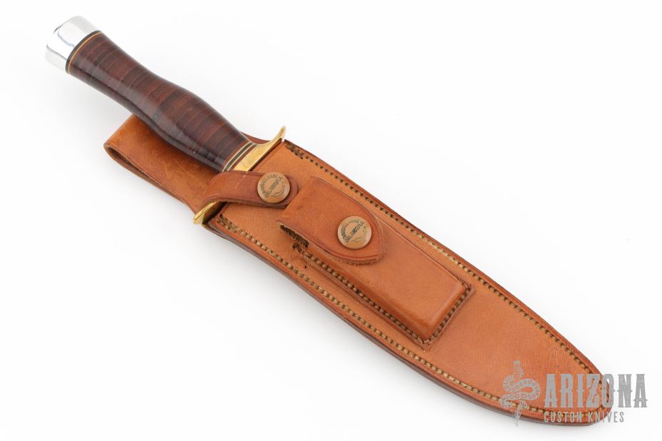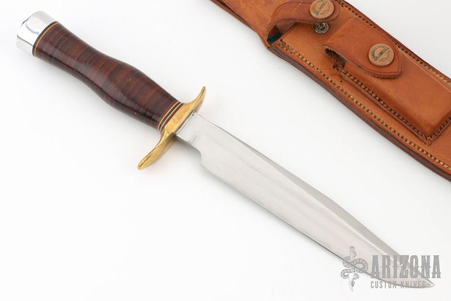 This model 1-7 by Randall Made Knives features a satin finished clip point blade with sharpened top edge, .243" blade stock and 1.107" blade depth, hidden tang construction. The handle has a brass guard, stacked leather grip and red, white and blue spacers, duralumin butt. Includes original brown button, brown leather sheath. Has some scratches, otherwise excellent condition for its age.