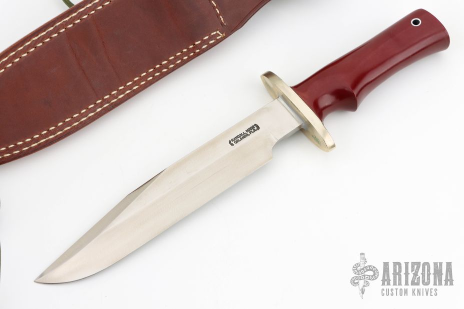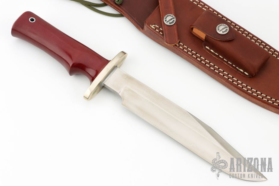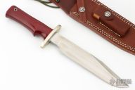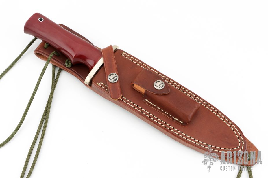 This Model 14 by Randall Made Knives features a satin finished blade with sharpened top edge, .208" blade stock. 1.330" blade depth, full tang construction. The handle has a nickel silver guard, red linen micarta handle with a lanyard hole at the butt. This knife was designed to meet the demand for an almost indestructible all-purpose knife, though it is especially suited for combat and survival purposes. Comes with a brown leather sheath. Excellent condition.