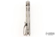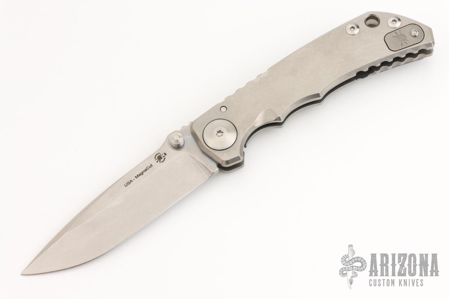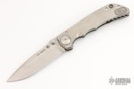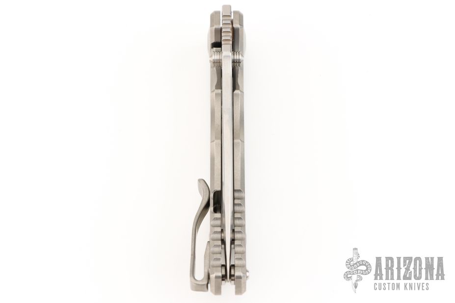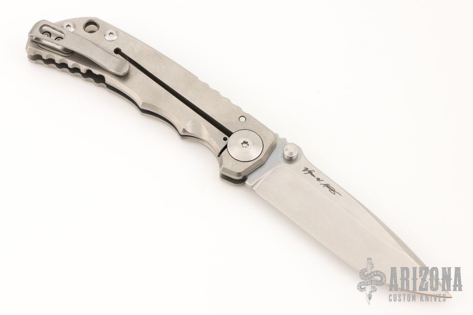 This framelock folder by Spartan Blades features a stonewashed drop point blade with dual thumbstuds and a notched thumbrest. The handle has a stonewashed titanium frame with tip up titanium clip. Has nice detent, lockup, and blade seating. Excellent condition. Comes with the original box and original clip. Has Lynch deep carry clip attached as well as includes a Lynch keychain. Excellent condition.