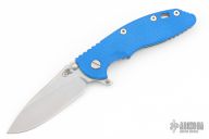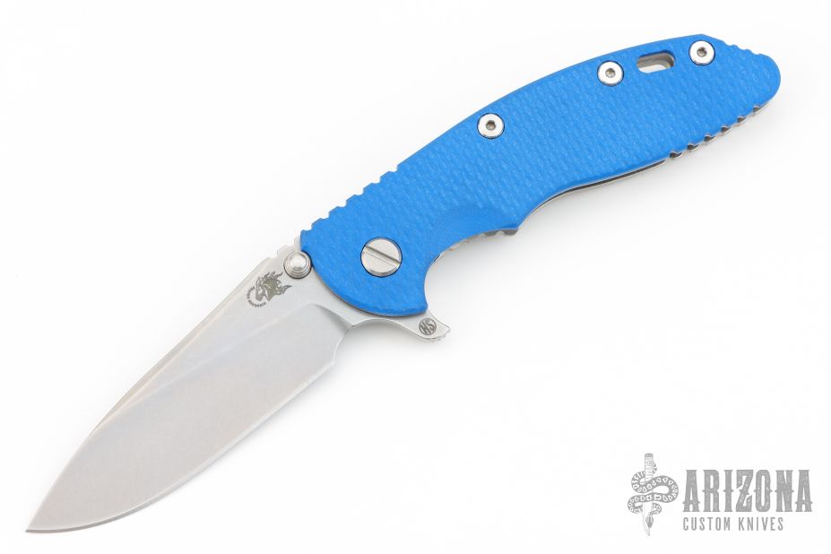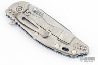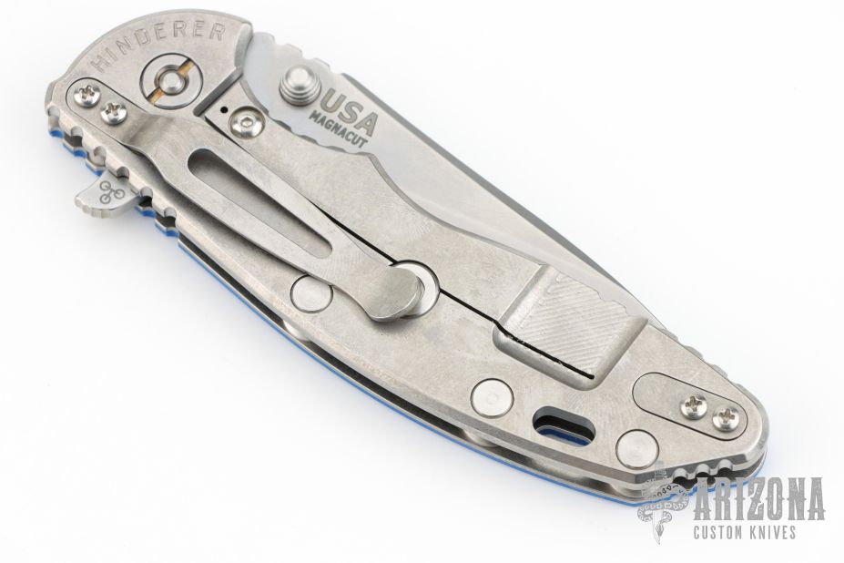 This Skinny XM-18 3.5" flipper by Rick Hinderer features a stonewashed blade with notched thumbrest and flipper. The handle has a stonewashed titanium frame with a blue G-10 scale, a tip up or down reversible titanium clip and filler tab, lanyard hole at the butt. Comes with original box and extra washers. Excellent condition.