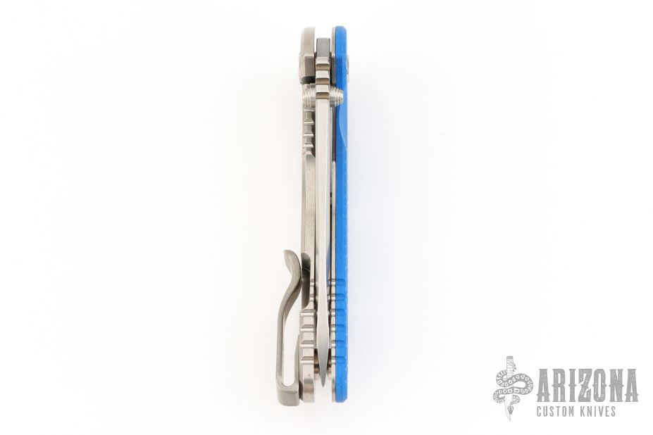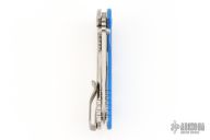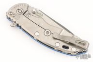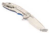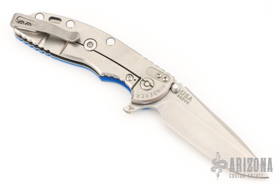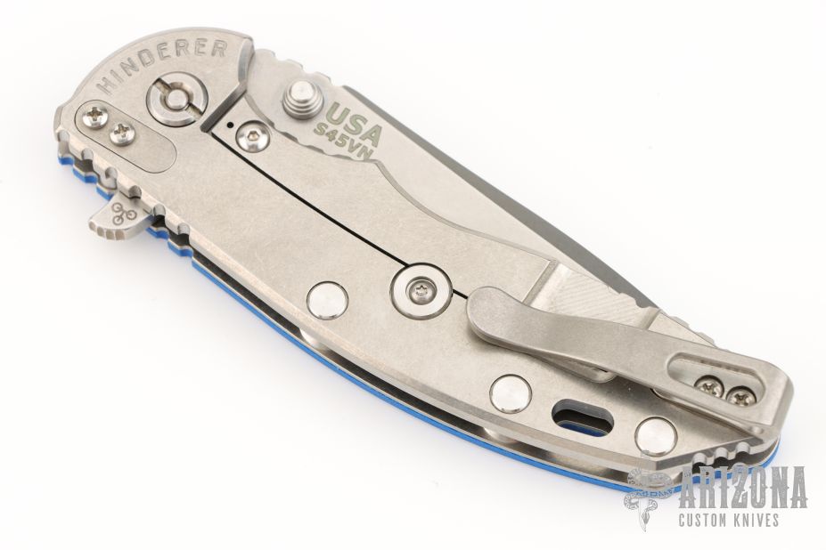 This XM-18 3.5" flipper by Rick Hinderer features a stonewashed blade with notched thumbrest and flipper. The handle has a stonewash titanium frame with a frag pattern blue G-10 scale, a tip up or down reversible titanium clip and filler tab, lanyard hole at the butt. Comes with original box and extra washers. Has Skiff bearings installed, has Lynch deep carry clip attached. Includes original clip and blue scale. Excellent condition.