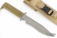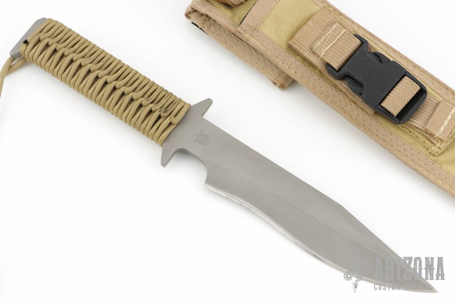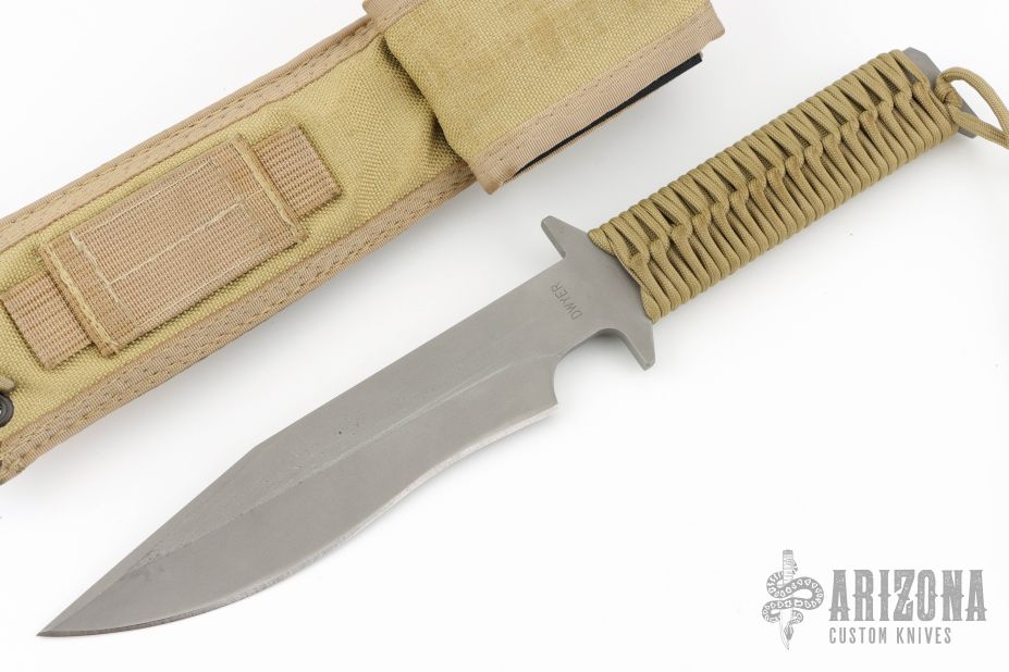 This D9 by Duane Dwyer features a bead blasted blade with false top edge, .252" blade stock and 1.538" blade depth, Integrated double guard with paracord wrapped grip. The blade has some sheath scratches, otherwise excellent condition. Comes with nylon sheath.