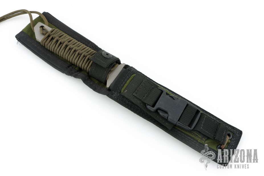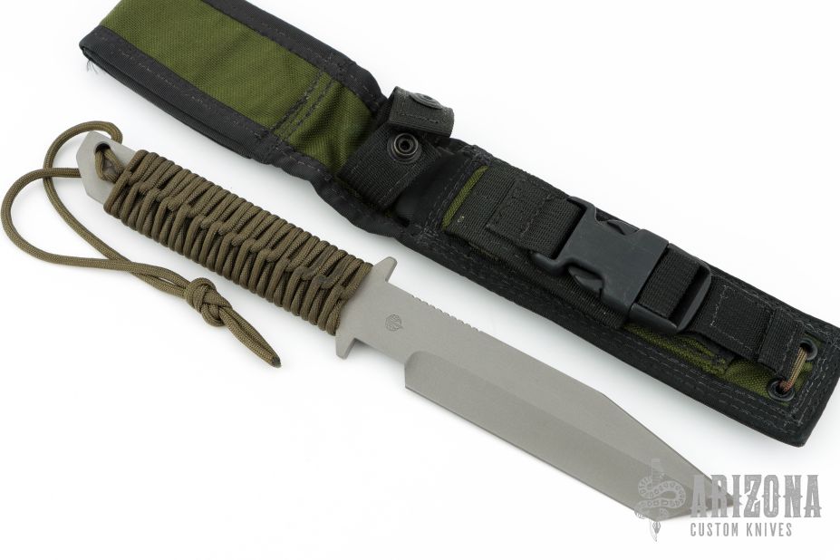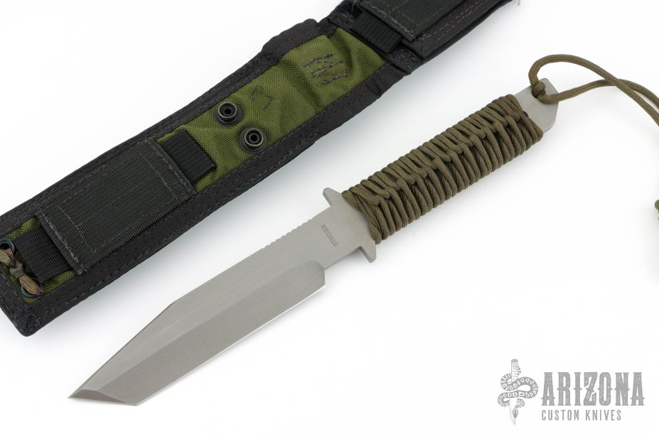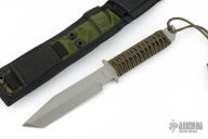 This tanto from Strider features a bead blasted tanto blade with false top edge and a notched thumbrest, .243" blade stock and 1.305" blade depth, full tang construction, paracord wrap. Includes nylon sheath with belt loop. Has some sheath scratches, otherwise excellent condition.