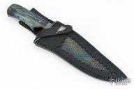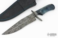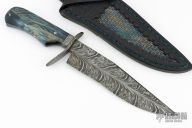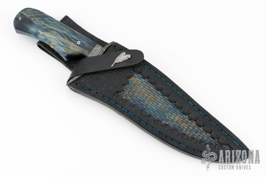 This Fighter by Abril Knives features a Feather Damascus clip point blade with false top edge, .201" blade stock and 1.971" blade depth, hidden tang construction. The handle has a Feather Damascus guard, Damascus spacer, and stabilized maple burl wood grip with single mosaic pin. Comes with hand-tooled leather sheath. Excellent work. New from maker!