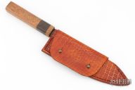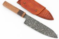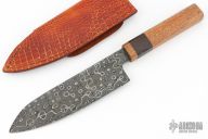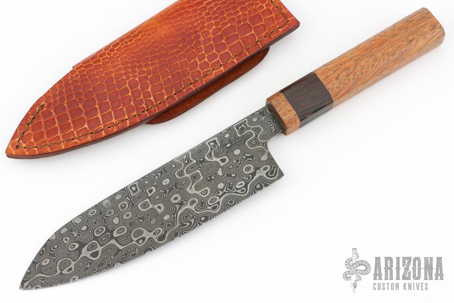 This Santoku by Abril Knives features a drop point raindrop pattern Damascus with .129" blade stock and 1.913" blade depth, hidden tang construction. The handle features a beautiful Wengue and Angelin wood grip. Comes with a very nice fold over leather sheath. Excellent work, New from maker!