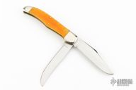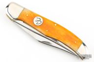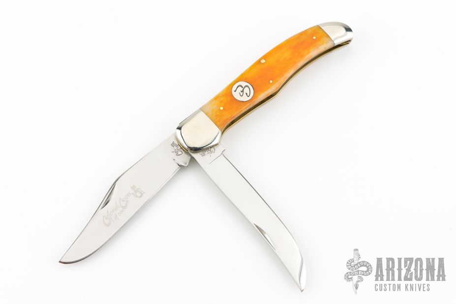 This 2-Blade Hunter by Colonel Coon features mirror finished blades with nail nicks. The handle has nickel silver bolsters, orange bone scales, brass liners, stainless steel springs. Comes with original box. Excellent condition. 1 of 200.
