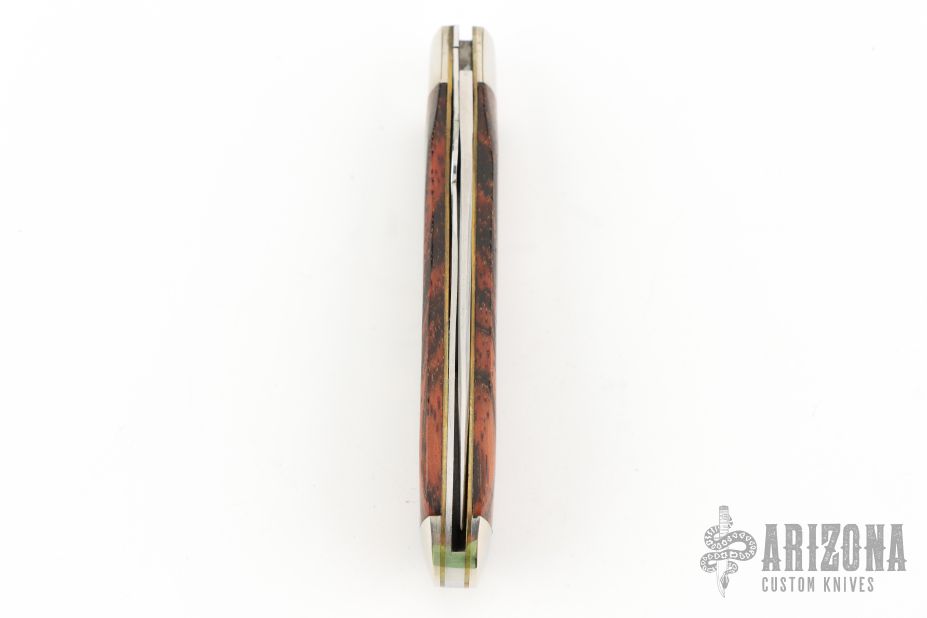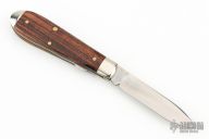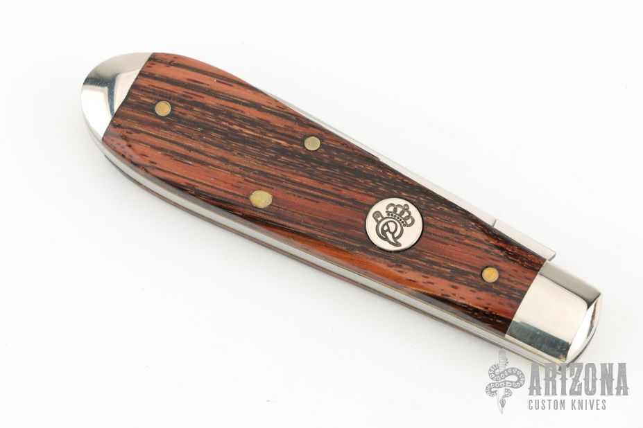 This Teardrop Linerlock by Queen Cutlery features a satin finished blade with nail nick. The handle has nickel silver bolsters, wood scales, brass liners, stainless steel springs and single steel liner. Comes with original box. Excellent condition.