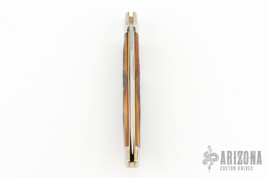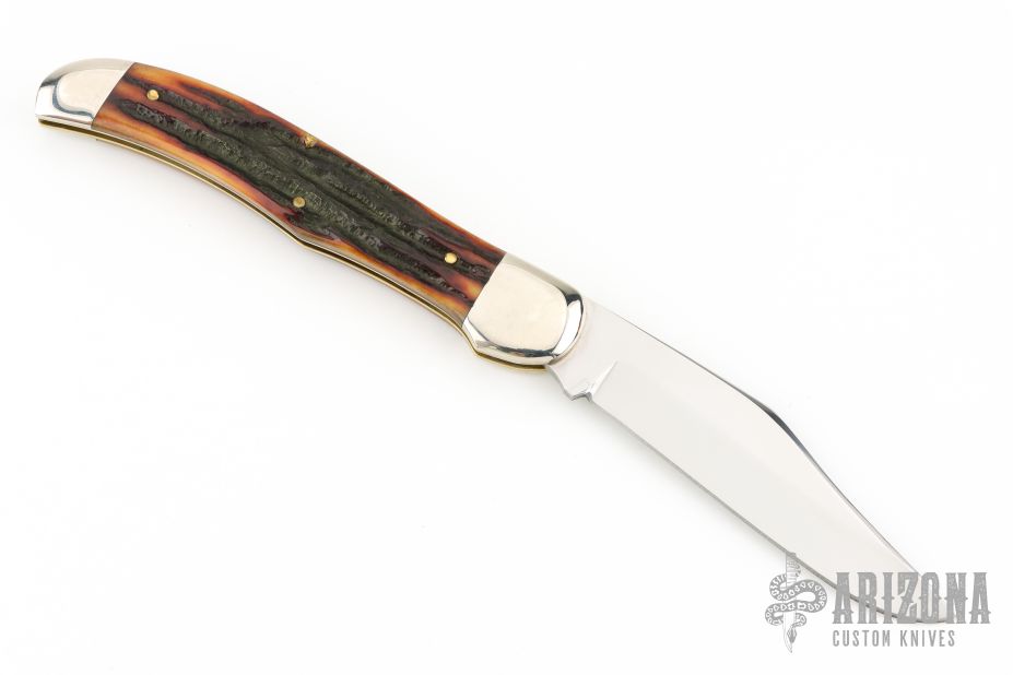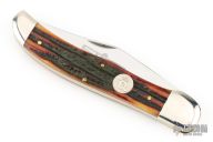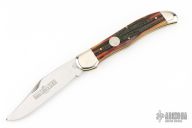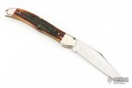 This slipjoint by Queen features a mirror polished blade with nail nick. The handle features nickel silver bolsters, brass liners and jigged bone covers. Stainless steel spring. Excellent condition. Comes with original box.