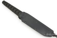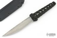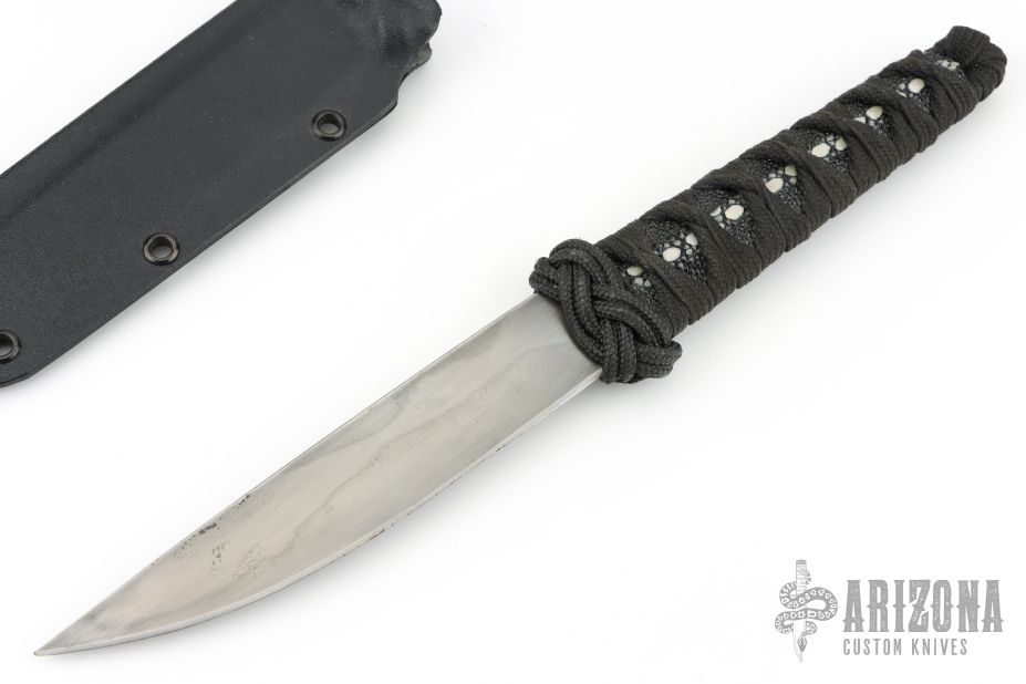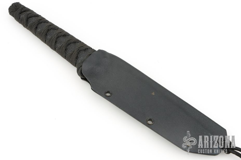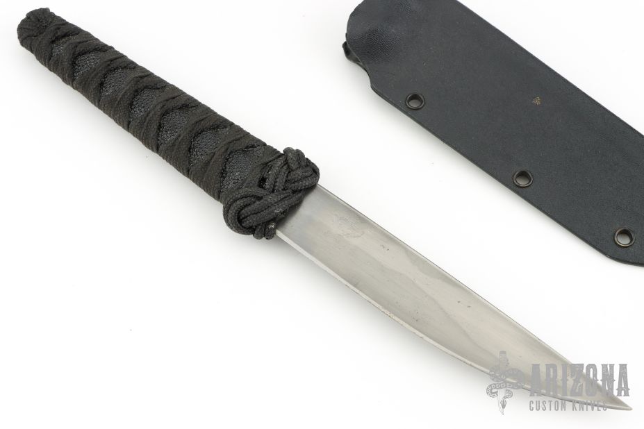 This Tanto by Steve Isbell features a hand rub satin finished tanto blade with hamon, .175" blade stock and 1.180" blade depth, hidden tang construction. The handle has black cord wrap over black stingray skin. Comes with a Kydex sheath. Has some light scratches and patina, good condition otherwise.
