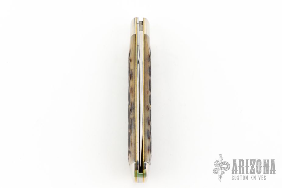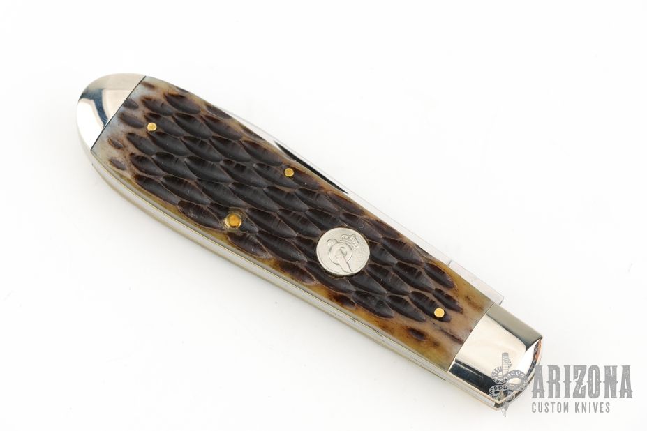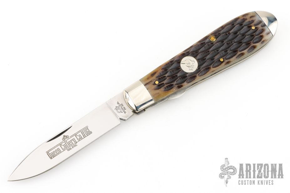 This Teardrop Linerlock by Queen Cutlery features a satin finished blade with nail nick. The handle has nickel silver bolsters, jigged bone scales, brass liners, stainless steel springs and single steel liner. Comes with original box. Excellent condition.