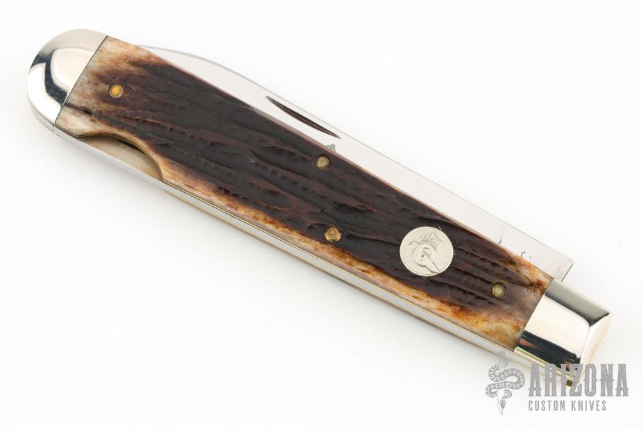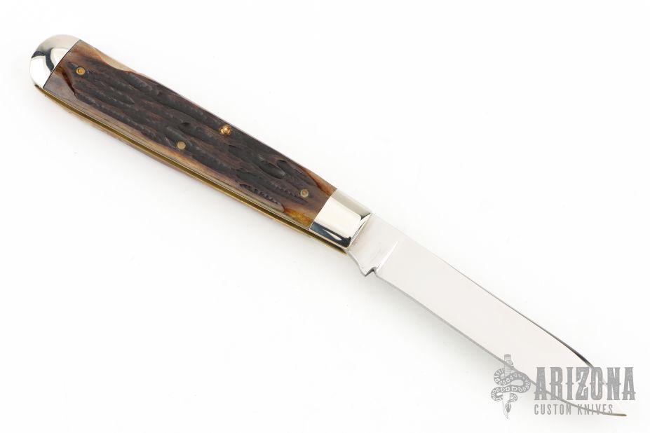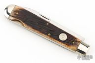 This lockback by Queen Cutlery features a mirror finished blade with nail nick. The handle has nickel silver bolsters, jigged bone scales, brass liners, stainless steel springs and single steel liner. Comes with original box. Excellent condition.