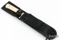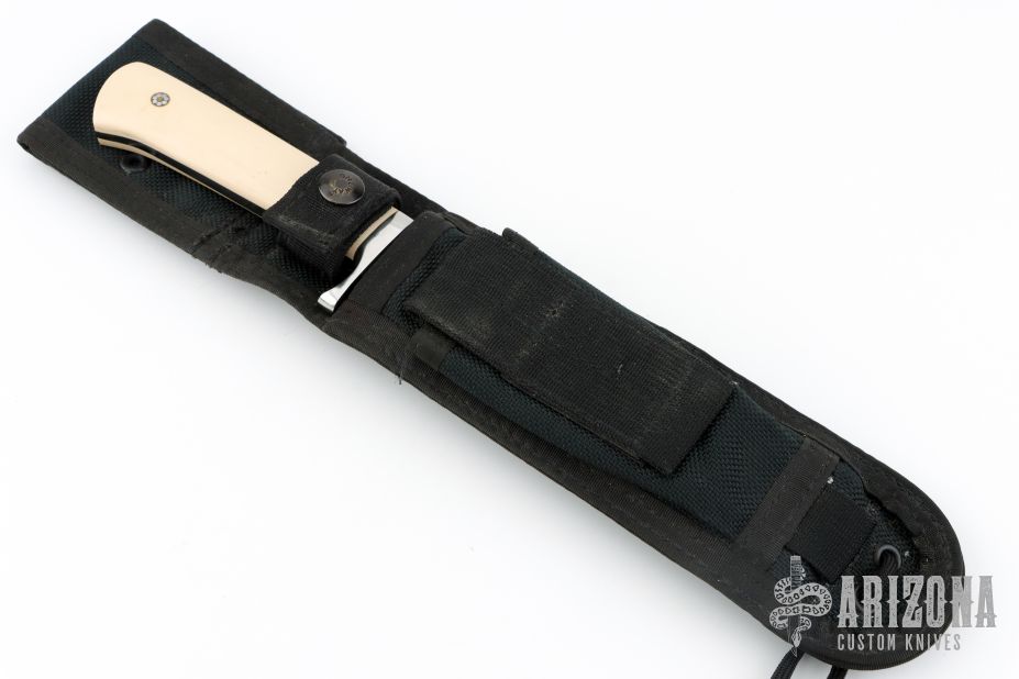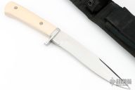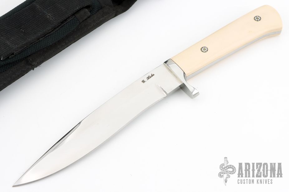 This Hunter by Gary Hicks features a mirror polished blade with false top edge, .256" blade stock and 1.132" blade depth, full tapered tang construction. The handle has a stainless steel guard, ivory paper micarta scales with mosaic pins. Comes with a black nylon sheath. Excellent condition.
